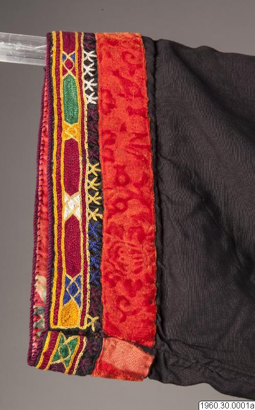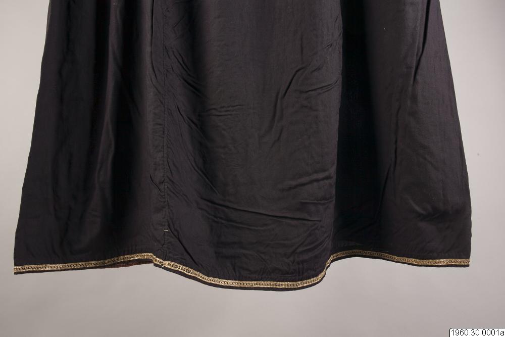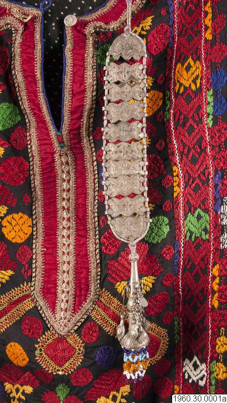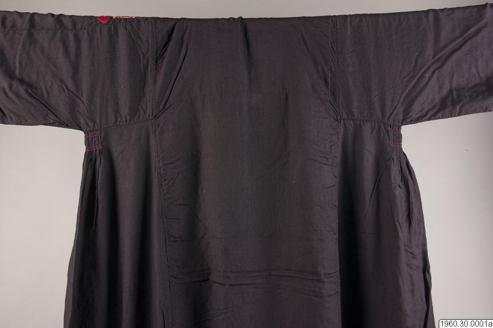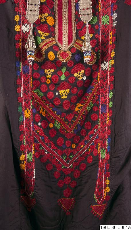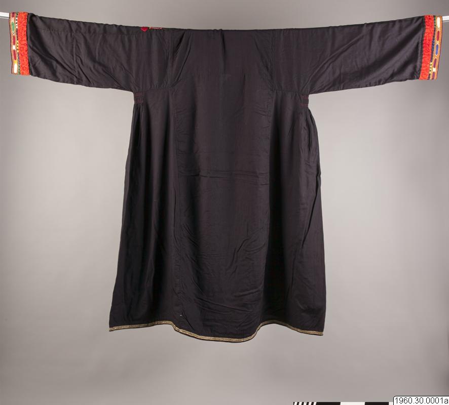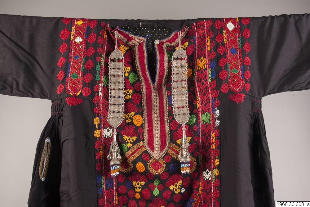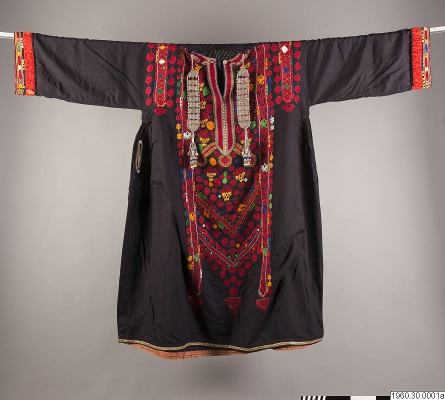 Dräkt som burits av en nomadkvinna. Klänning av svart bomullstyg. Framsidan prydd med broderier i rött men också andra färger. Vid halsen också broderier i metalltråd. Nedre delen av ärmen även prydd med broderier och ett påsytt rött samentsband. Ficka i höger sida kantad med metalltrådsnören liksom kanten längst ner på klänningen. Från båda sidor av halslinningen hänger två smycken i silverliknande metall. Dessa smycken består av sammanfogade plattor och längst ner en knoppliknande del prydd med små glaspärlor. Klänningens längd: 127 cm, Bredd upptill (ärmarna inräknade): 170 cm. Möjligen satt de båda smyckena inte på dräkten då denna insamlades.
