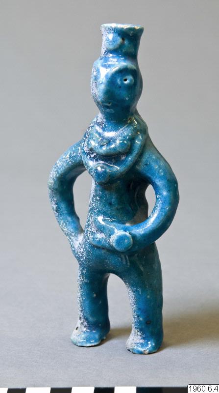 Blå keramikfigurin. Ena sidan dålit bränd. Försedd med huvudbonad och halssmycken. Håller den ena handen på magen, den andra i sidan. Baksidan platt. Ögon och näsborrar markerade med hål. Gjord i byn Isalif, vilken är känd för sin keramiktillvekning. 16,5 cm hög. Se: J. Sibinga Mulder, Afghanistan, indrukken van een verblijf, Koninklijk Institut voor de Tropen, Amsterdam, Medeling no. CXXVI, Afdel...