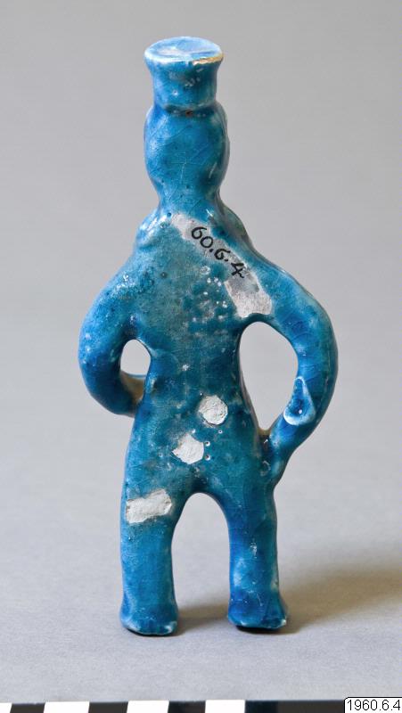 Blå keramikfigurin. Ena sidan dålit bränd. Försedd med huvudbonad och halssmycken. Håller den ena handen på magen, den andra i sidan. Baksidan platt. Ögon och näsborrar markerade med hål. Gjord i byn Isalif, vilken är känd för sin keramiktillvekning. 16,5 cm hög. Se: J. Sibinga Mulder, Afghanistan, indrukken van een verblijf, Koninklijk Institut voor de Tropen, Amsterdam, Medeling no. CXXVI, Afdelnig Culturele en Physische Antropologie, no. 57. 1957. p. 38 f.