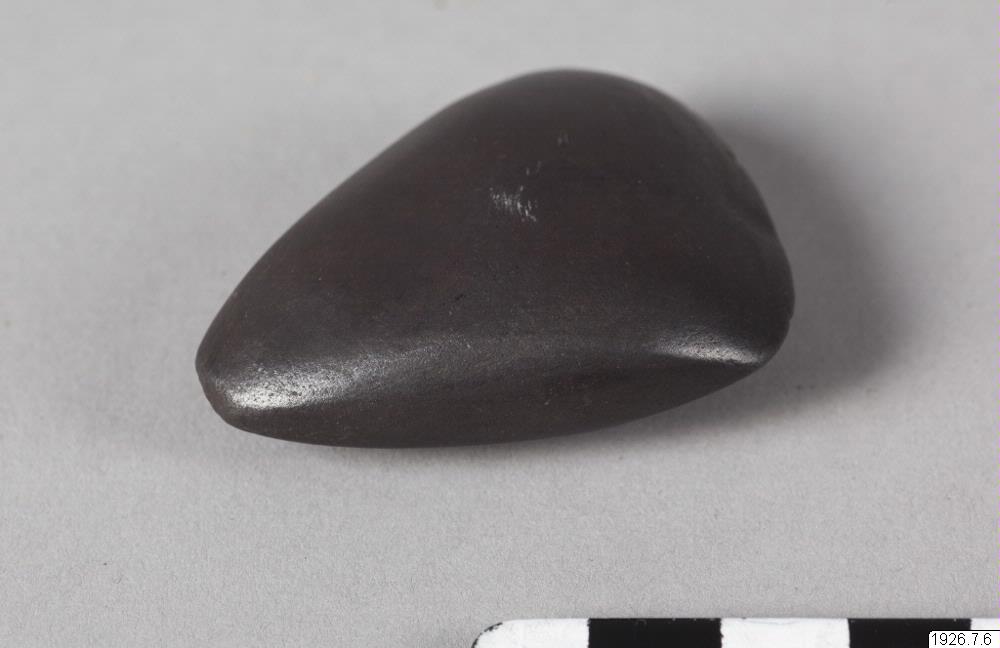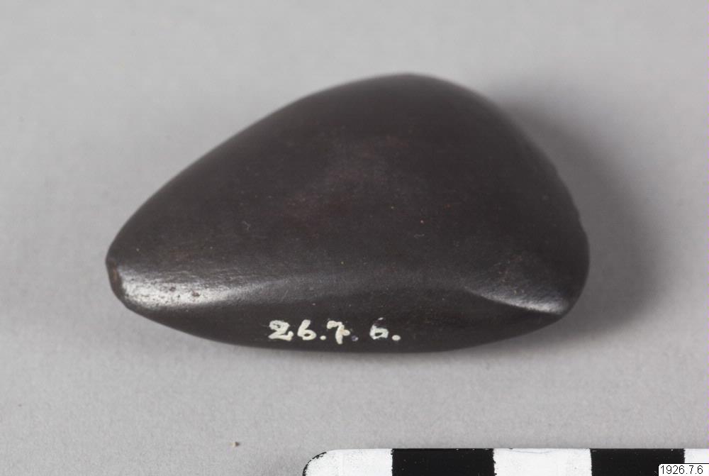 Stenyxa. Gåva av sjökapten Hjalmar Anzelius, Tarapoto, gm. dr. D. Melin Inkaisk kultur i norra Perú. En s.k. huaco. Jfr. denna typ av svartgodshuvuden GEM:s 20.2.26, avbildat och kommenteratt som fig.59A, sid. 125 i Gösta Montell: Dress and Ornaments in Ancient Peru, Göteborg 1929.