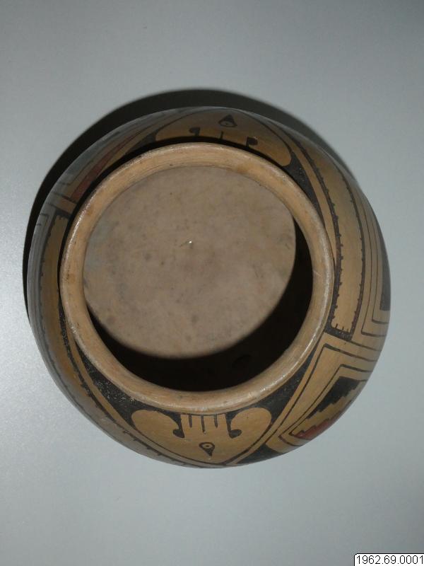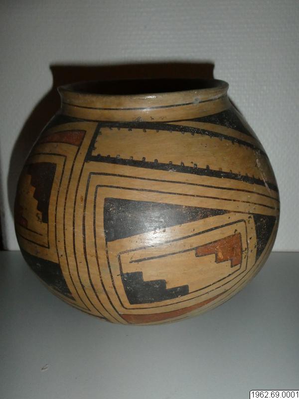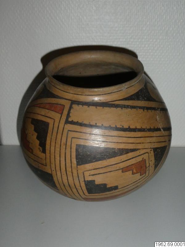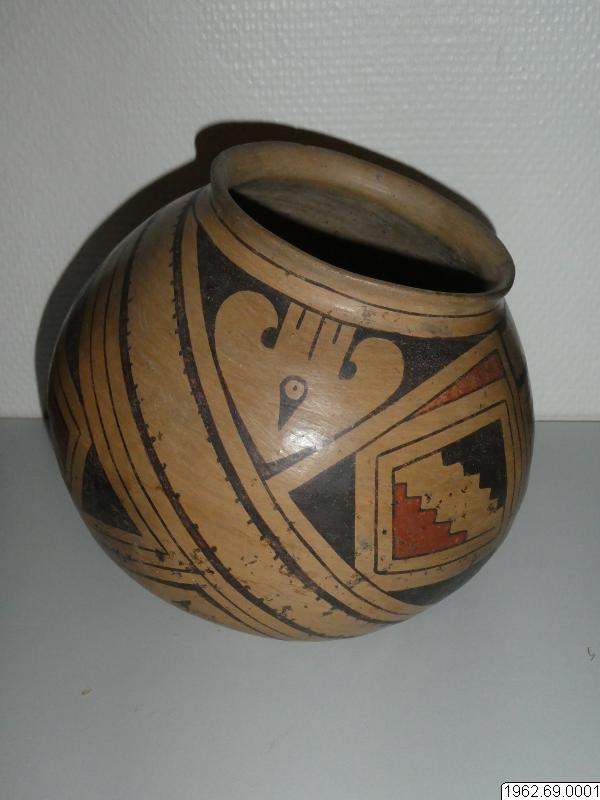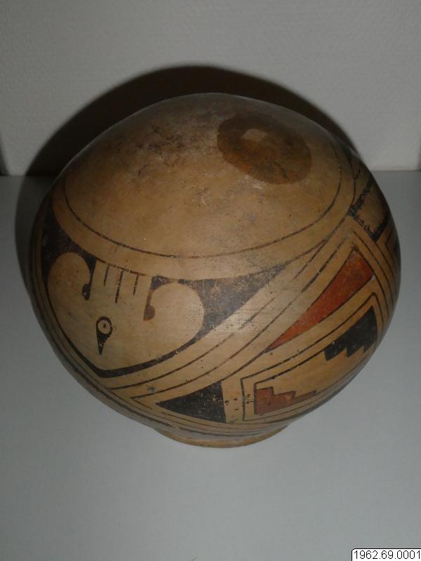 Ur generalkatalogen: 18,3 cm högt globulärt lerkärl, målat i huvudsakligen geometrisk stil i svart och tegelfärg på gult. Kärlet är från Cultura Casas Grande i Chihuahua, en kultur som keramiskt påminner om sydvästra Nordamerika. I dekoren ingår även ett stiliserat fågelhuvud. Ur "Karl Erik Magnus Östlunds samling" gjord på 1910-talet. För jämförelse hänvisas bland annat till "Esplendor del México Antiguo", tomo I, pag. 433 och motsvarande text om Casas Grande-kulturen, pag. 431. Namn på originalspråk: recipiente Registrerad av Teobaldo Ramirez 2009-07-27