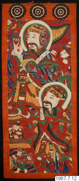 Ur generalkatalogen: Rituell målning på papper. Storlek: 102 cm x 43 cm. Yao-taoistisk.Insamlaren lämnar frågan om dess tolkning öppen tills vidare. Målad i Mung Sing, norra Laos, omkring 1880 av kinesisk specialist (naturaliserad yao). Se: Peter K. Kandre: Autonomy and Integration of Social Systems: The Iu Mien ("Yao" or "Man") Mountain Population and Their Neighbors. Särskilt pp. 588 och 622. I: Peter Kunstadter (ed.): Southeast Asian Tribes, Minorities and Nations. Vol II. Princeton 1967.