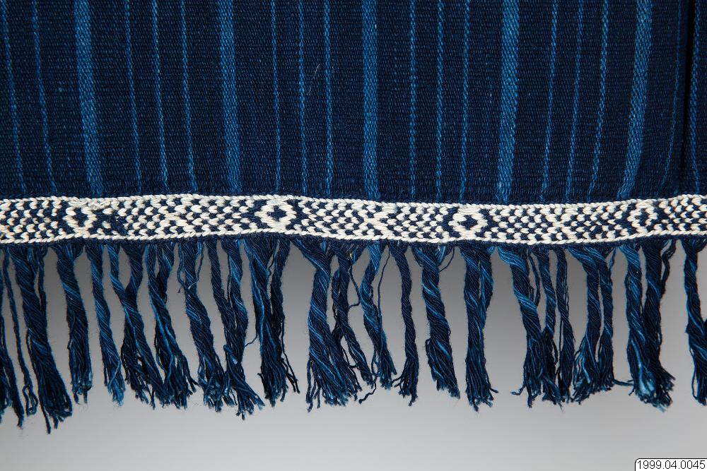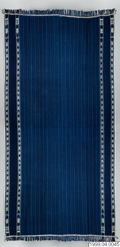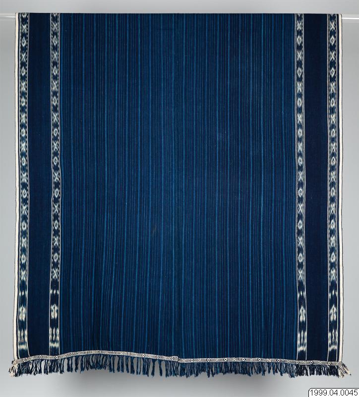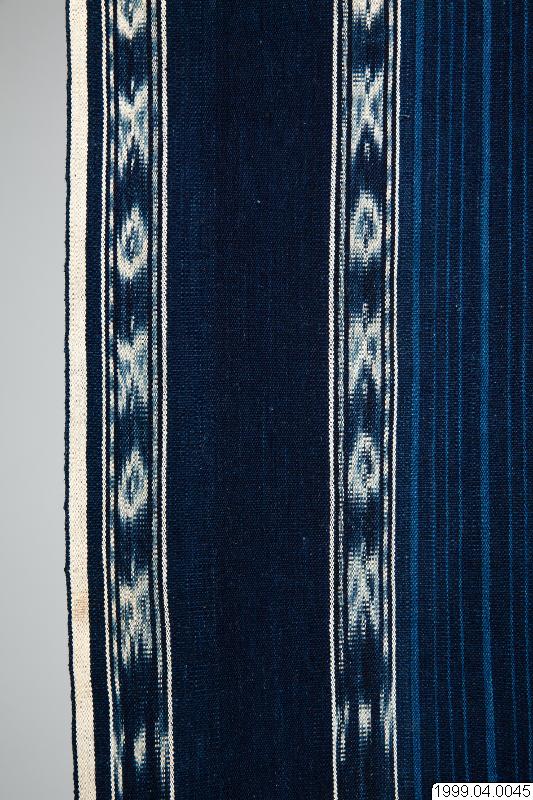 Hanggi gundu Kodi är en naturlig växtplats för indigo som brukas till textilier av rituell och ceremoniell betydelse. Traditionell gundi wora asli som bärs av män. Tillverkad av handspunnen kraftig bomull av Paulina Pati Bebe. Förutom som kläder åt de levande, brukas vävnader som liksvepningar och gravgåvor. Den avlidne, eller dennes förfader, anses kunna använda tyg som ett nytt skinn om de önskar återvända till jordelivet. För detta ändamål anses breda vävnader som tillverkats av grovt garn vara mest ändamålsenliga. De värderas högst och ger en kraftig och slittålig vävnad, en hud som ger gott skydd. En kombination av randig varprips i vävnadens mittfält och vita ikat bårder som framträder mot en mörkt indigofärgad bakgrund. Schatteringarna från ljust till mörkt representerar för kodineserna livscykeln, från ungdom till ålderdom, eller från födsel till död. Garnet har Paulina färgat i wora, Indigo tinctoria. Numera är det få kvinnor i Kodidistriktet som behärskar växtfärgning. Kunskapen går i arv från mor till dotter och recepten är väl bevarade hemligheter. Indigofärgerskorna, med sina avslöjande blå händer, har en särställning i samhället och omges med respekt som gränsar till rädsla. De besitter kunskaper om användandet av medicinalväxter och fungerar som jordemödrar. De sysslar med indigofärg som associeras till nytt liv och död. Lukten från det jäsande indigobadet sägs påminna om liklukt. Eftersom de redan luktar död används indigofärgade textilier som liksvepningar. Beredningen av färgbaden jämförs med tillkomsten av nytt liv. Enligt äldre föreställningar bildas foster genom att blod koagulerar i livmodern. Mannens sperma påskyndar koaguleringen. Kärlet som används vid beredning av indigo är en symbol för livmodern. Ett steg i tillverkningen av den blå färgen består i att man häller kalk i badet. Kalken fäller ut färgämnet så att det lägger sig i tjocka sjok på botten av kärlet. Den vita kalken som får indigon att ”koagulera” symboliserar mannens sperma. Ikatmotiv: witi bangga, hundars ben, hamoli som är omegaformade guldsmycken som ingår i den del av brudpriset som brudgummens familj ska ge brudens familj som ´ersättning för flickan i faderns hus´. Formen på en hamoli anses vara densamma som på kvinnans genetalier. Mata dadu, spelkort, kadanga kodorro, ett redskap för att vinda rep och avbildas som ett stiliserat kryss. Den står för önskan att ett gift par ska arbeta nära tillsammans, att deras relation ska vara lika tät som rep på en kadanga kadorro, mata karimboyo, vattenbuffelns öga. En Hanggi är normalt 240-260 cm lång och 120-160 cm bred. På en rundväv, grunden för alla sumbanesiska textilier, blir alltid ett parti ovävt. För att inte inslagen ska repas upp, på textilier som är avsedda för män, sträcks varpen i en för ändamålet avsedd ram och förses med dekorativa vävda bårder som i Kodi kallas kalidur, motiv: förutom kadenga kadorro avbildas mata karimboyo, vattenbuffelns öga. Varpen öppnas och sys ihop längs varsin stadkant, fransarna är inte tvinnade och snodda. Det kodinesiska ordet gundu betyder ´från bergen´, i vidare betydelse, utifrån, utländsk´. Enligt uppgifter i Kodi introducerades den av väverskor från Endeh, Flores (Gearnaert 1989:75). Även Hoskins uppger att gundu associeras till muslimska sjöfarande folk främst Makassareser-endehneserfolken som länge kontrollerade handeln mellan öarna och fortfarande upprätthåller små kustbosättningar i Kodi, Waikelo och Memboro (Hoskins 1993:232). Köpt av Paulina Pate Bebe, Desa Homba Karipit, Kecamatan Kodi, västra Sumba, Indonesien. Förvärvad 1999.07.31 Hoskins, Janet 1993 The Play of Time. Kodi Perspectives on Calendars, History and Exchange. University of California Press, Berkely Wellfelt, Emilie, Livgivare och dödsbringare. Tyg och symbolism på Västsumba, Indonesien, C-uppsats i socialantropologi Lunds Universitet VT 2000