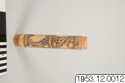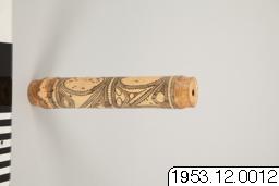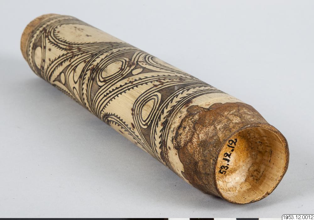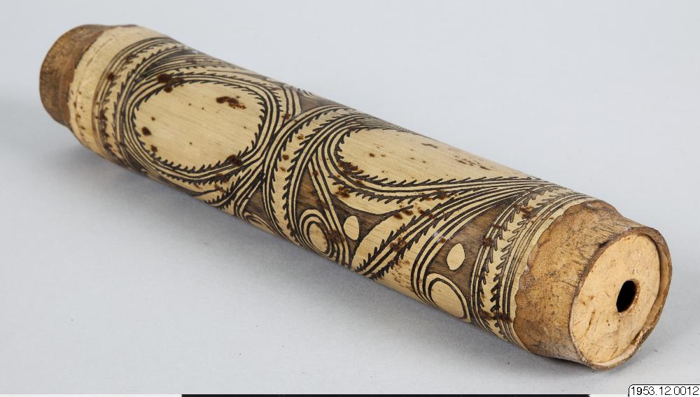 Kalkdosa av bambu. Utsidan smyckad med mönster som erhållits genom ristning och nerskärning. De ristade och nerskurna partierna gråa och svarta i färgen. Vänd! O. Reche: Der Kaiserin-Augusta-Fluss. (Ergebnisse der Südsee-Expedition 1908-1910. II. Ethnographie: A. Melanesien. Band 1. Hamburg 1913.) P. 254: Am Mittellauf (des Kaiserin-Augusta Flusses) bestehen die weitaus meisten Kalkgefässe aus Bambu: vielleicht wird der Flaschenkurbis hier nicht angebaut, erts in der Nähe des Hunstein-Gebirges tritt er wieder haüfiger auf.