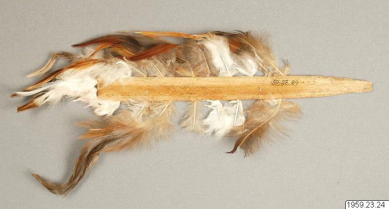 Långsmal platta av lätt träslag i vilket fjädrar är in- stuckna. Längd 29 cm. Hårprydnad. Originalnr. I. 5888. Insamlad av Axel Bojsen-Möller under dennes resa 1955-56. Byte Etnografisk Samling,