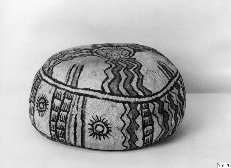 • Huvudbeklädnad för man. Yttre hölje av basttyg som mönstrats med målningar i ljus-och mörkbrunt. Inre stoppning av bladstrimlor. Diameter: 25 cm