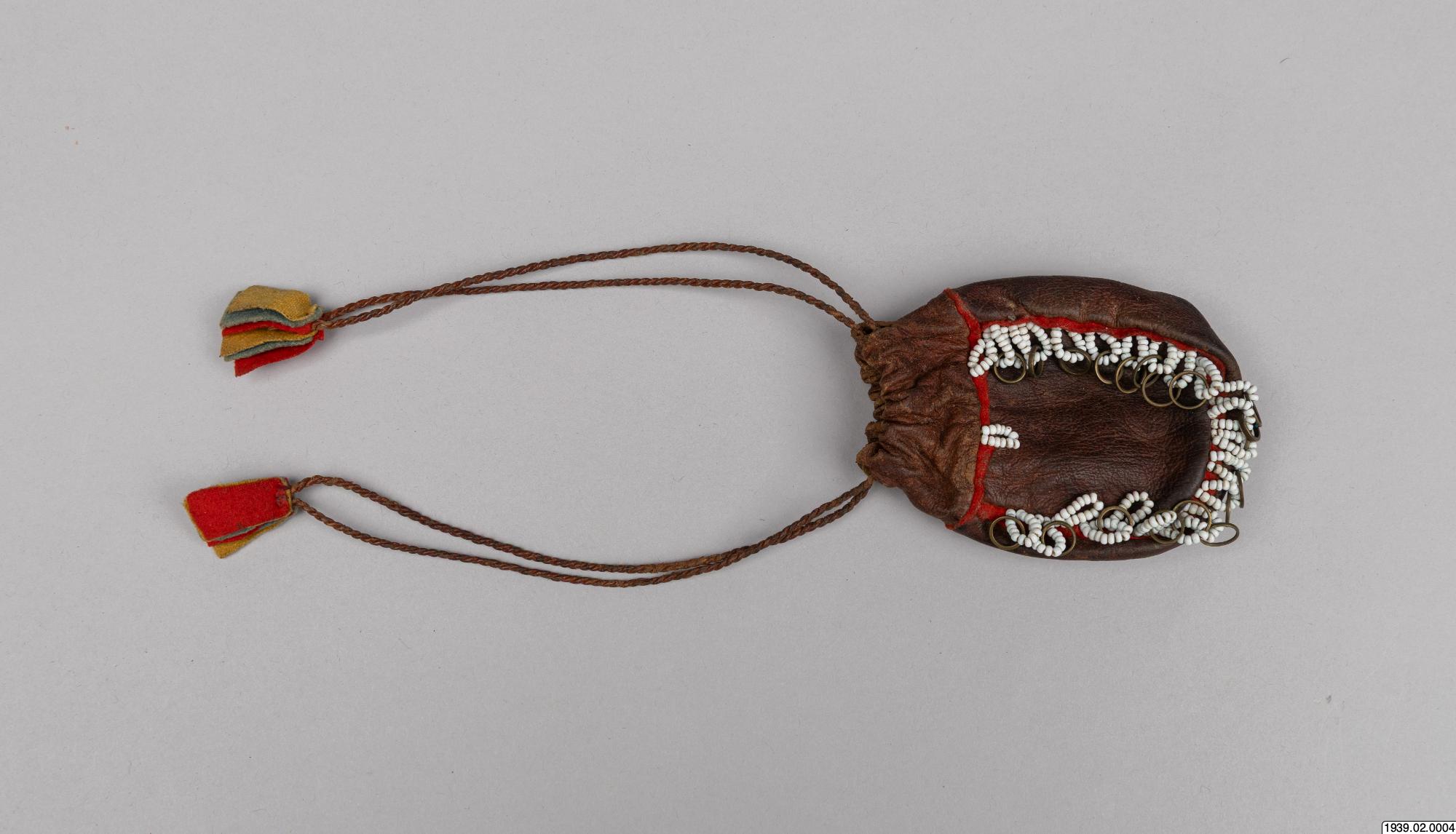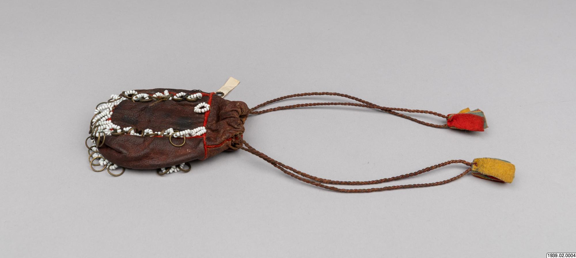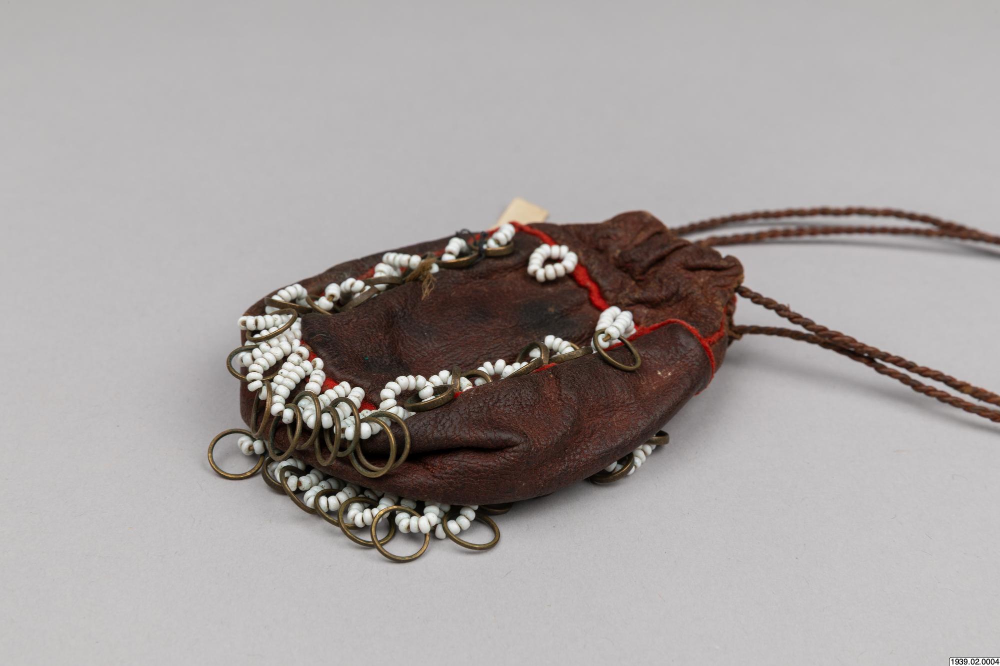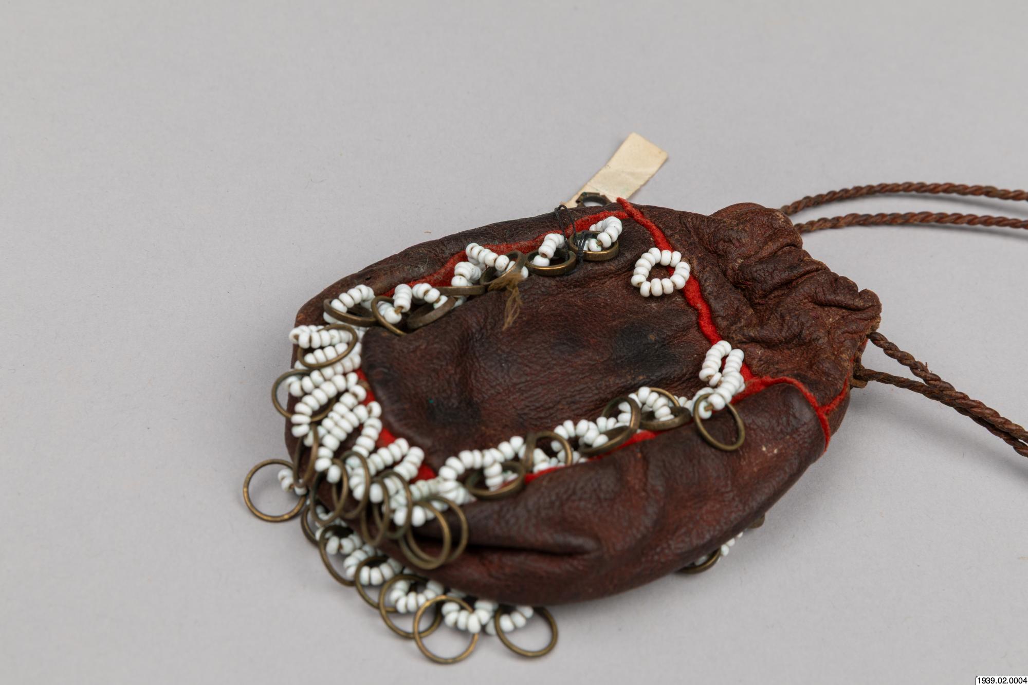 Penningpung av läder m. påsydda glaspärlor o. kopparringar. Att fästa vid bältet t. kvinnolappdräkten. Inköpt den 9 januari 1939 från lappmannen Torkel Larsson, Storvallen, Funäsdalen.