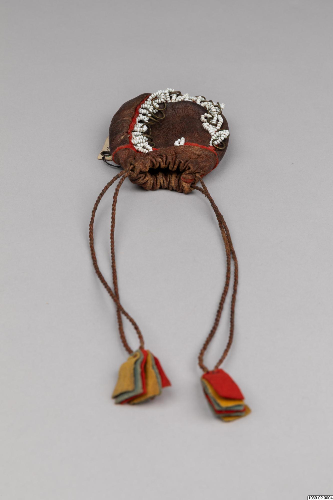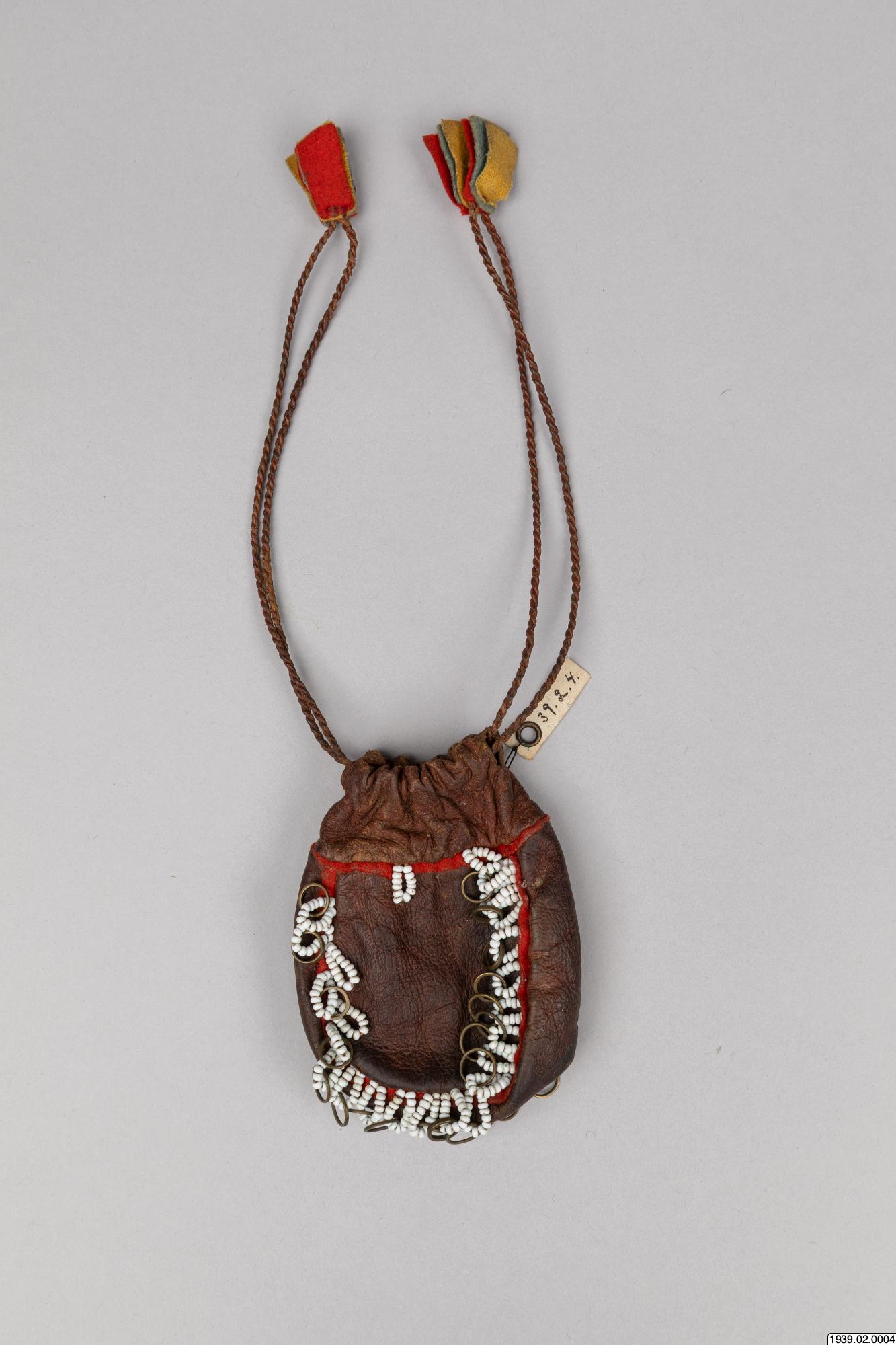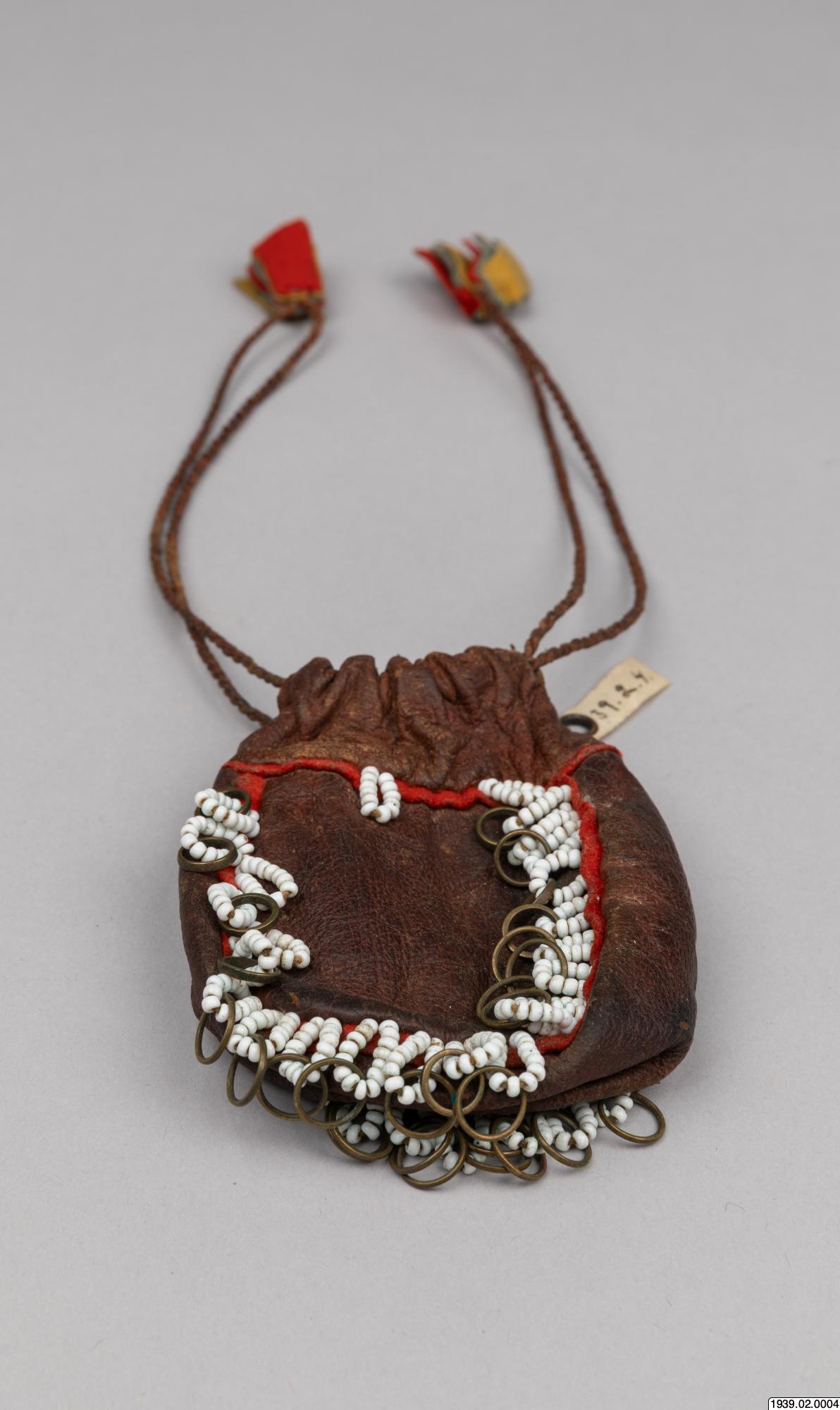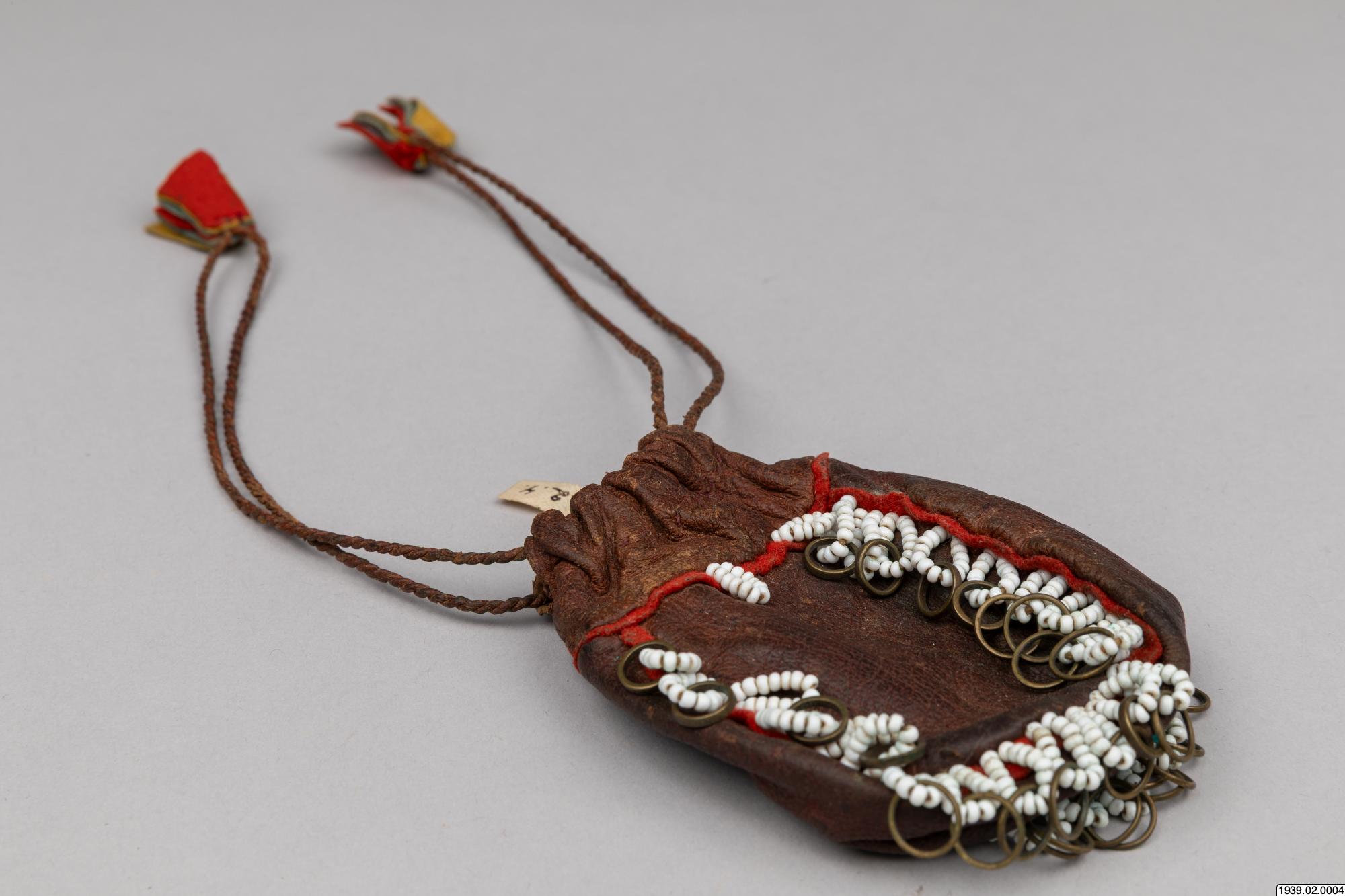 Penningpung av läder m. påsydda glaspärlor o. kopparringar. Att fästa vid bältet t. kvinnolappdräkten. Inköpt den 9 januari 1939 från lappmannen Torkel Larsson, Storvallen, Funäsdalen.