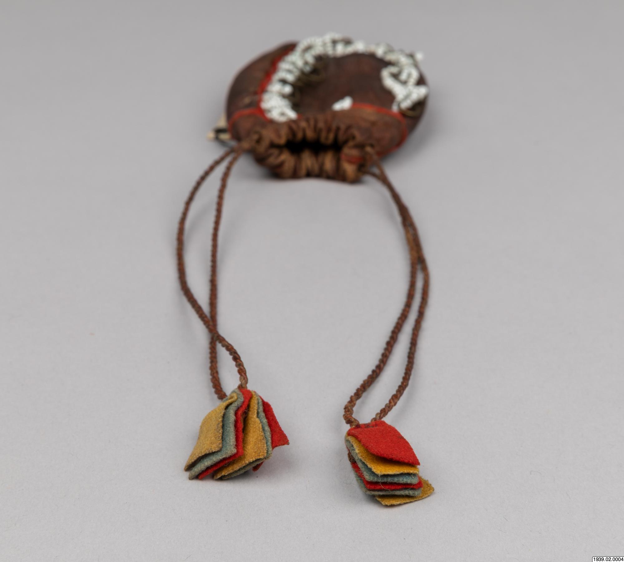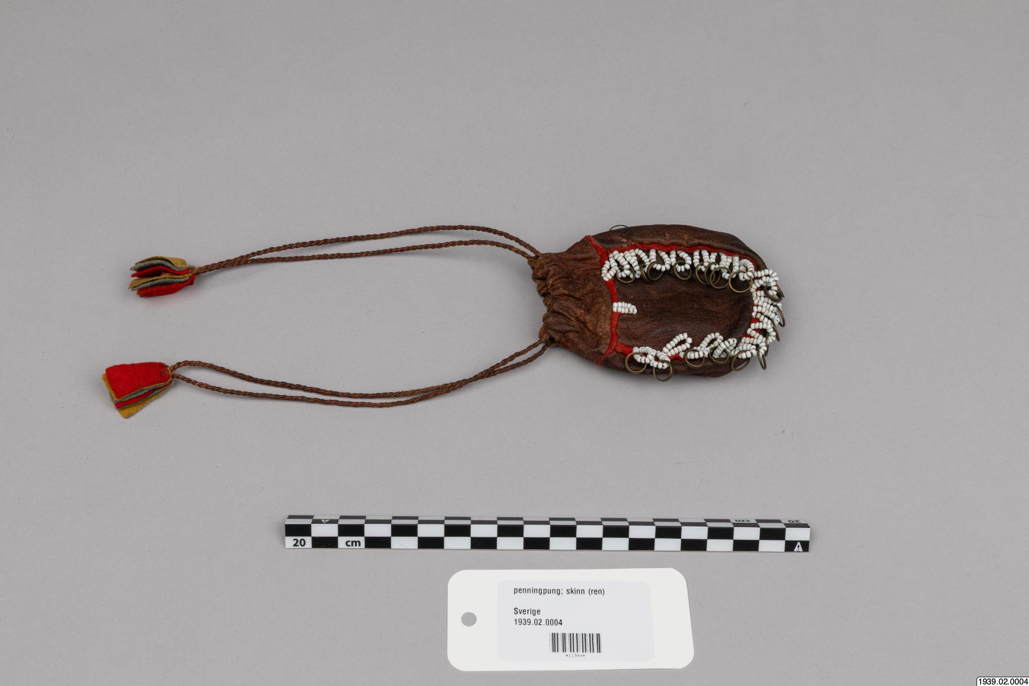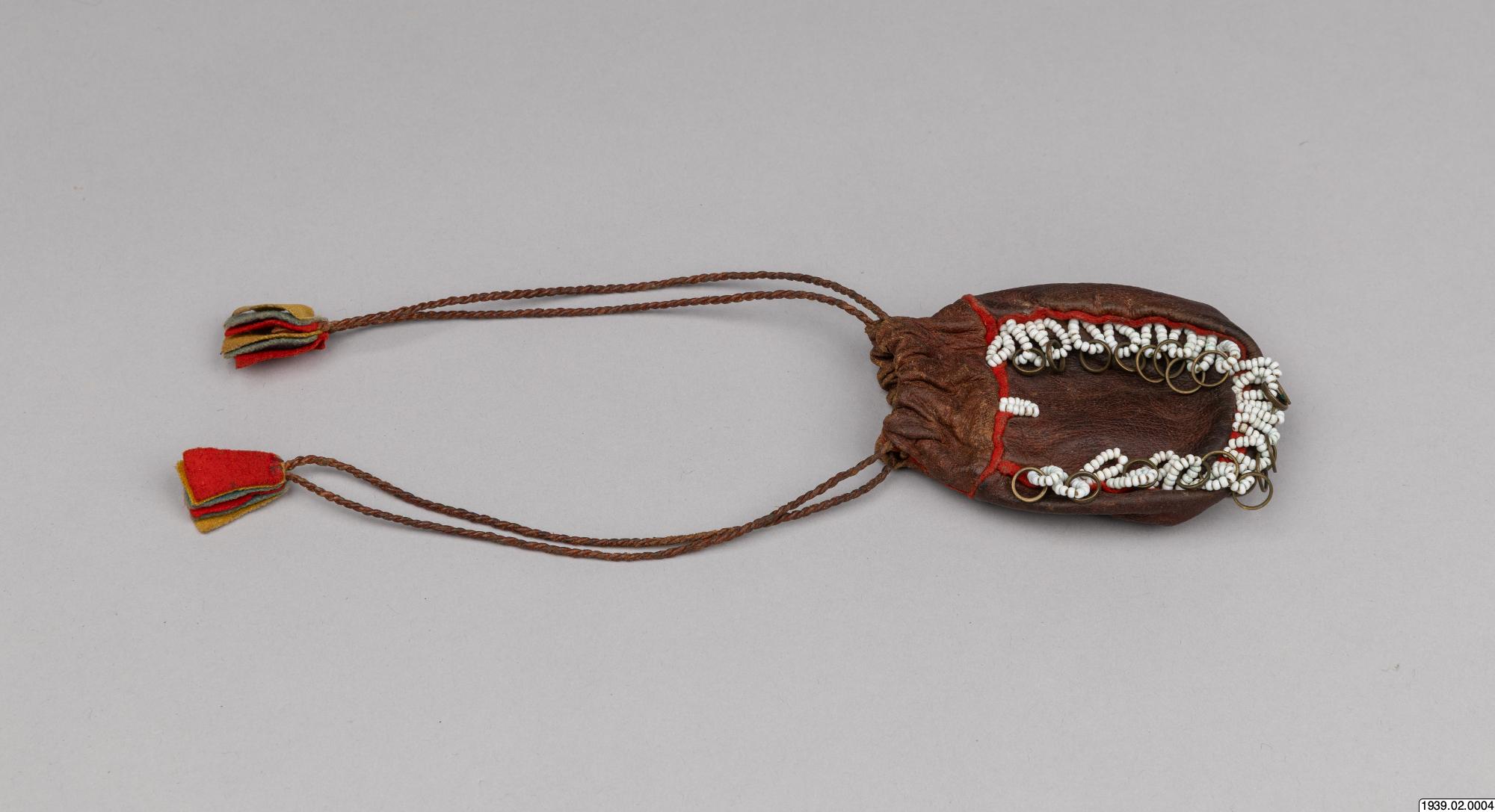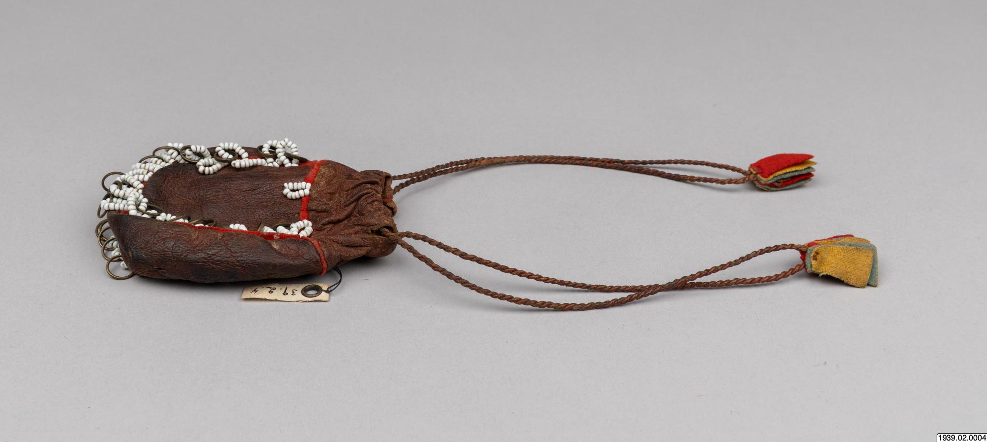 Penningpung av läder m. påsydda glaspärlor o. kopparringar. Att fästa vid bältet t. kvinnolappdräkten. Inköpt den 9 januari 1939 från lappmannen Torkel Larsson, Storvallen, Funäsdalen.