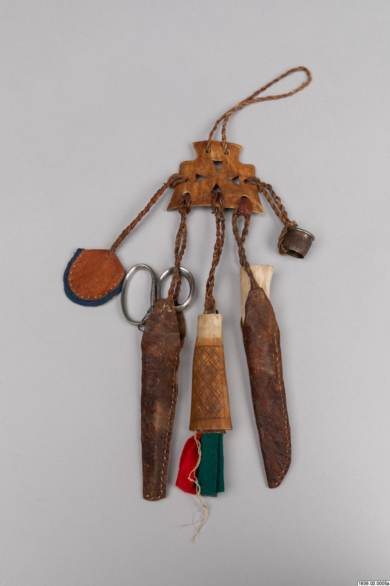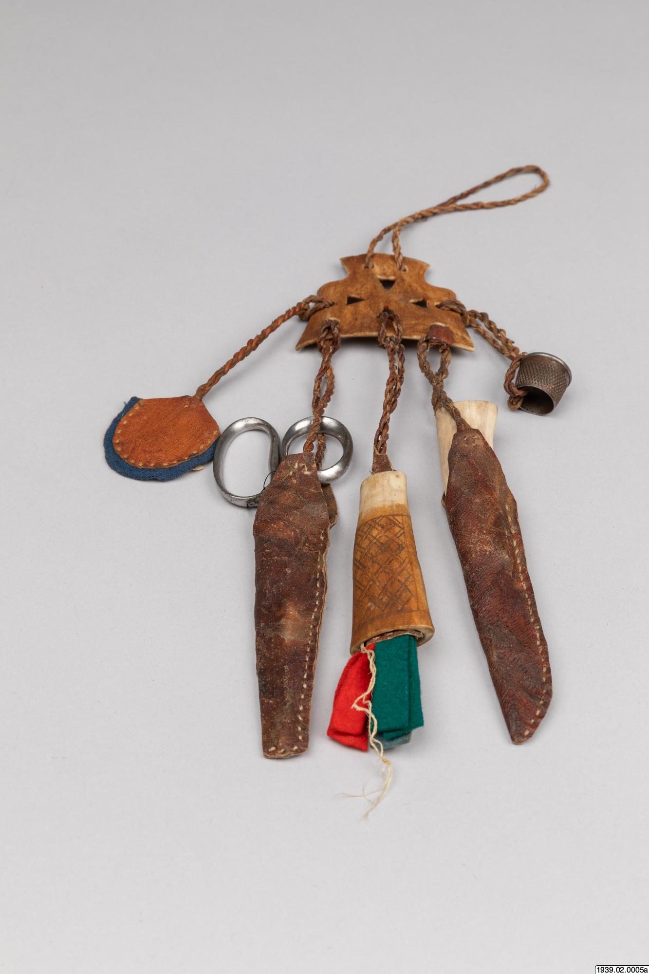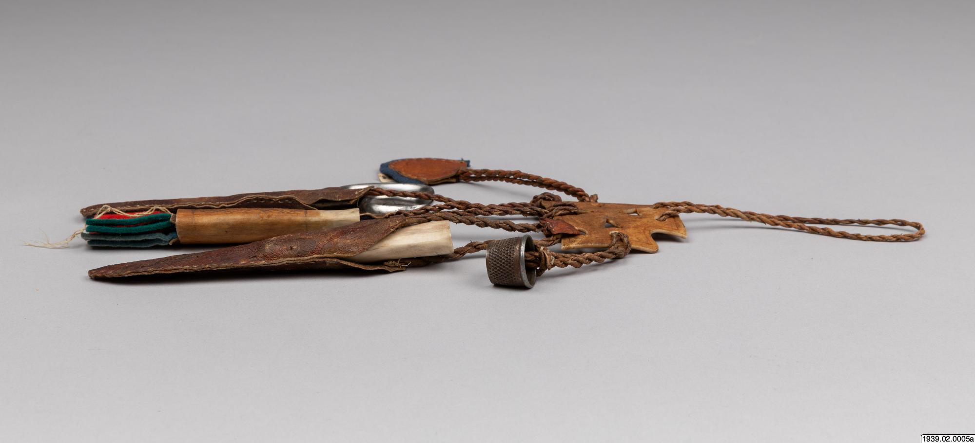 • Syställ av ben att fästa vid bältet. (Med tillhörande syverktyg, märkta b,c,d,e,f.)