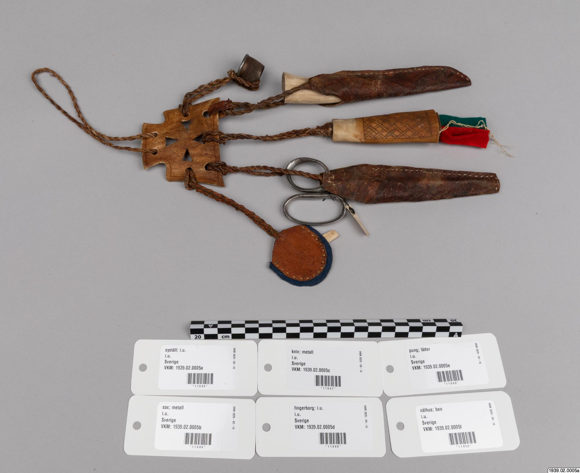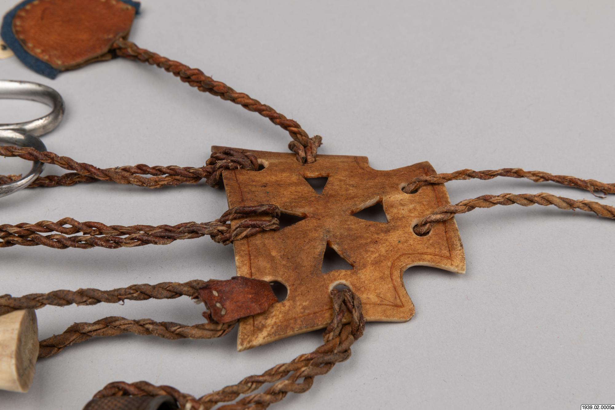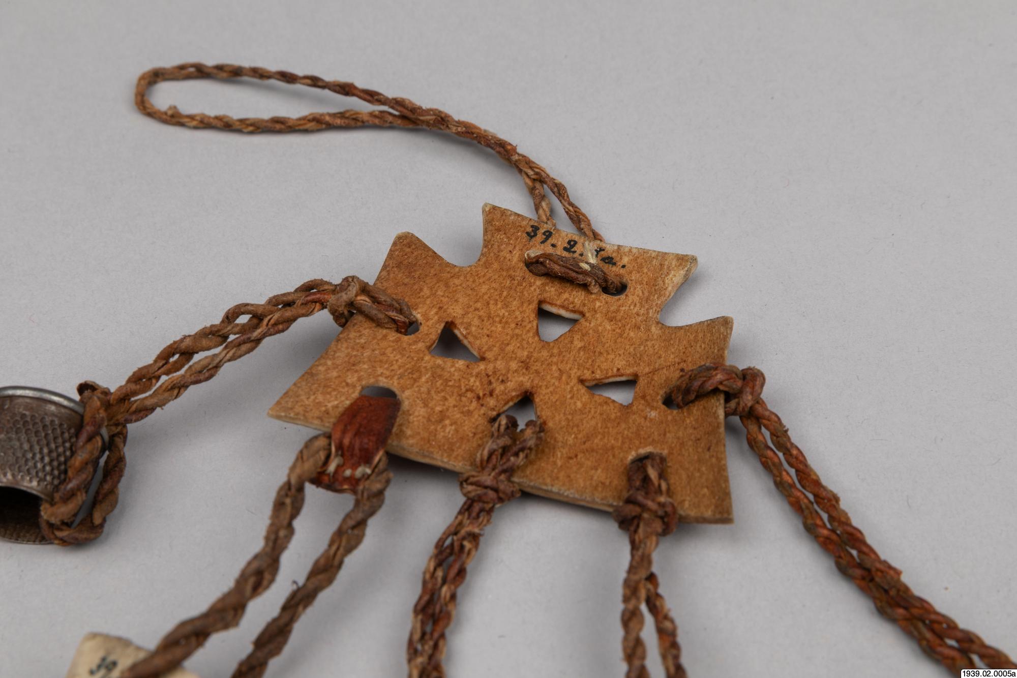 • Syställ av ben att fästa vid bältet. (Med tillhörande syverktyg, märkta b,c,d,e,f.)