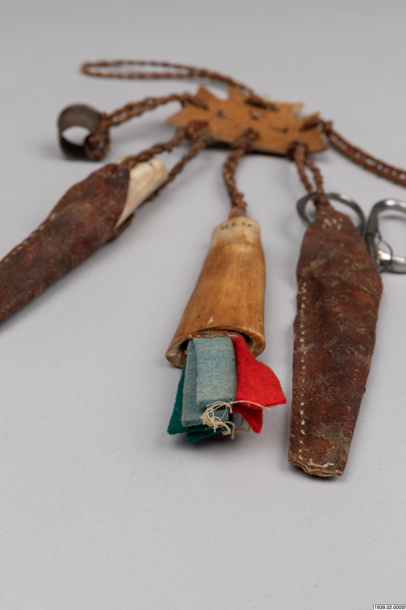 • Nåldosa av ben, fäst vid systället 39.2.5a. ,tillhörande kvinnolappdräkten 39.2