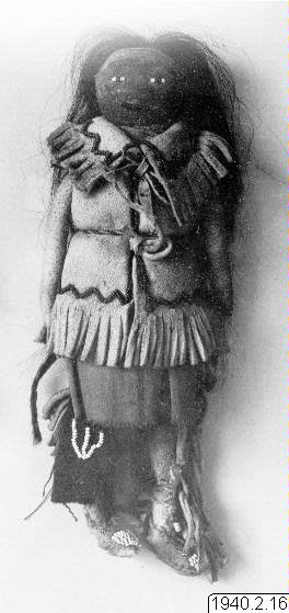 * En docka med kläder av skinn. Glaspärlor förmodligen utsmyckar kläderna. Förmodligen från västra USA. -N.W. 2000-04-11