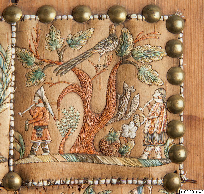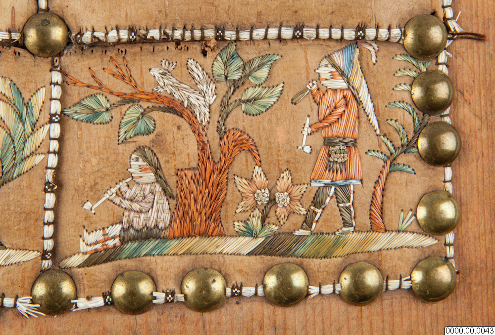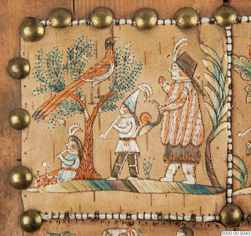 Broderi på nävfer, föreställande infödingdräkter från Canada. Bilderna äro åstadkomna med de färgade taggarna av kanadensiska piggsvinet. Gåva av Häradsh. Palm