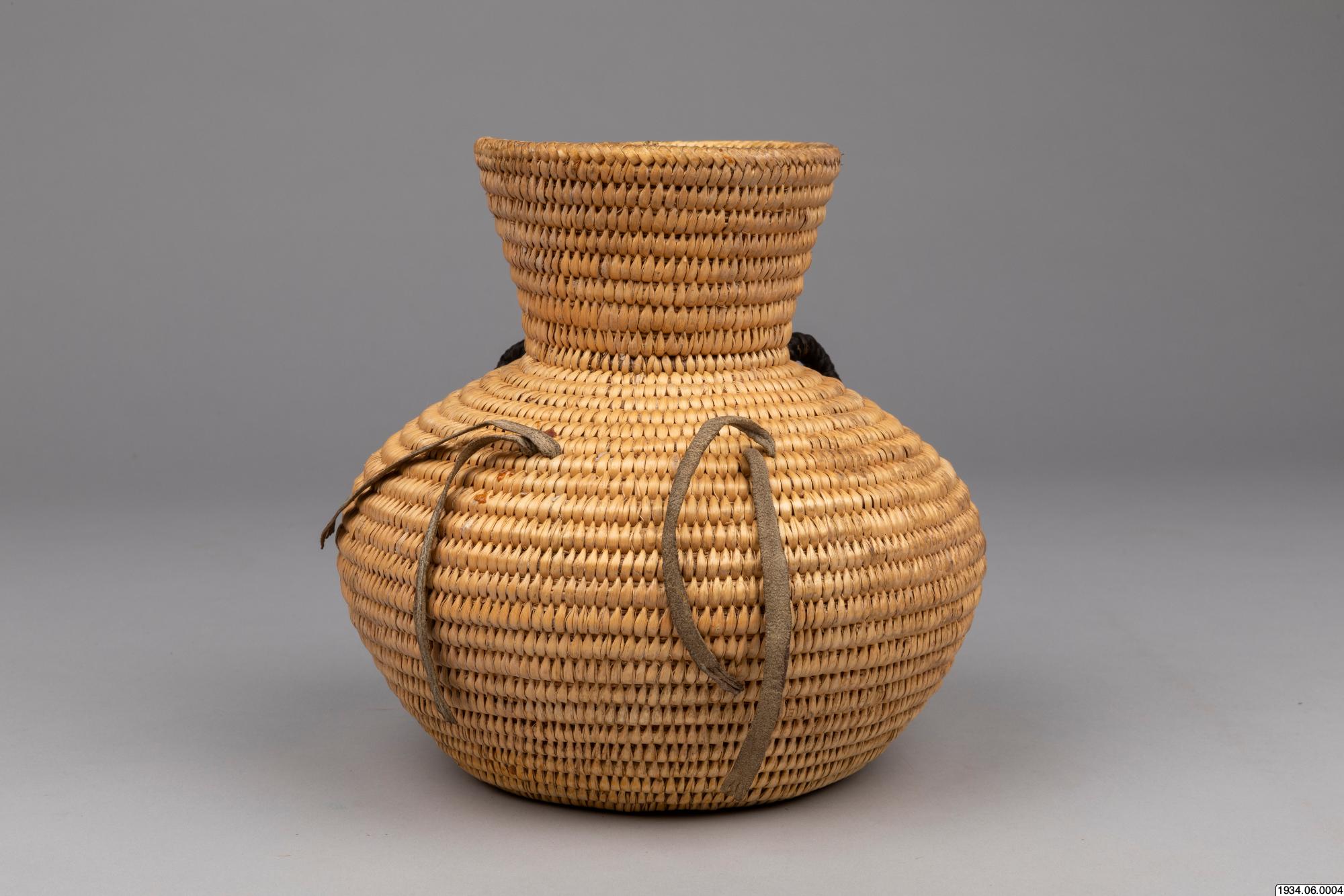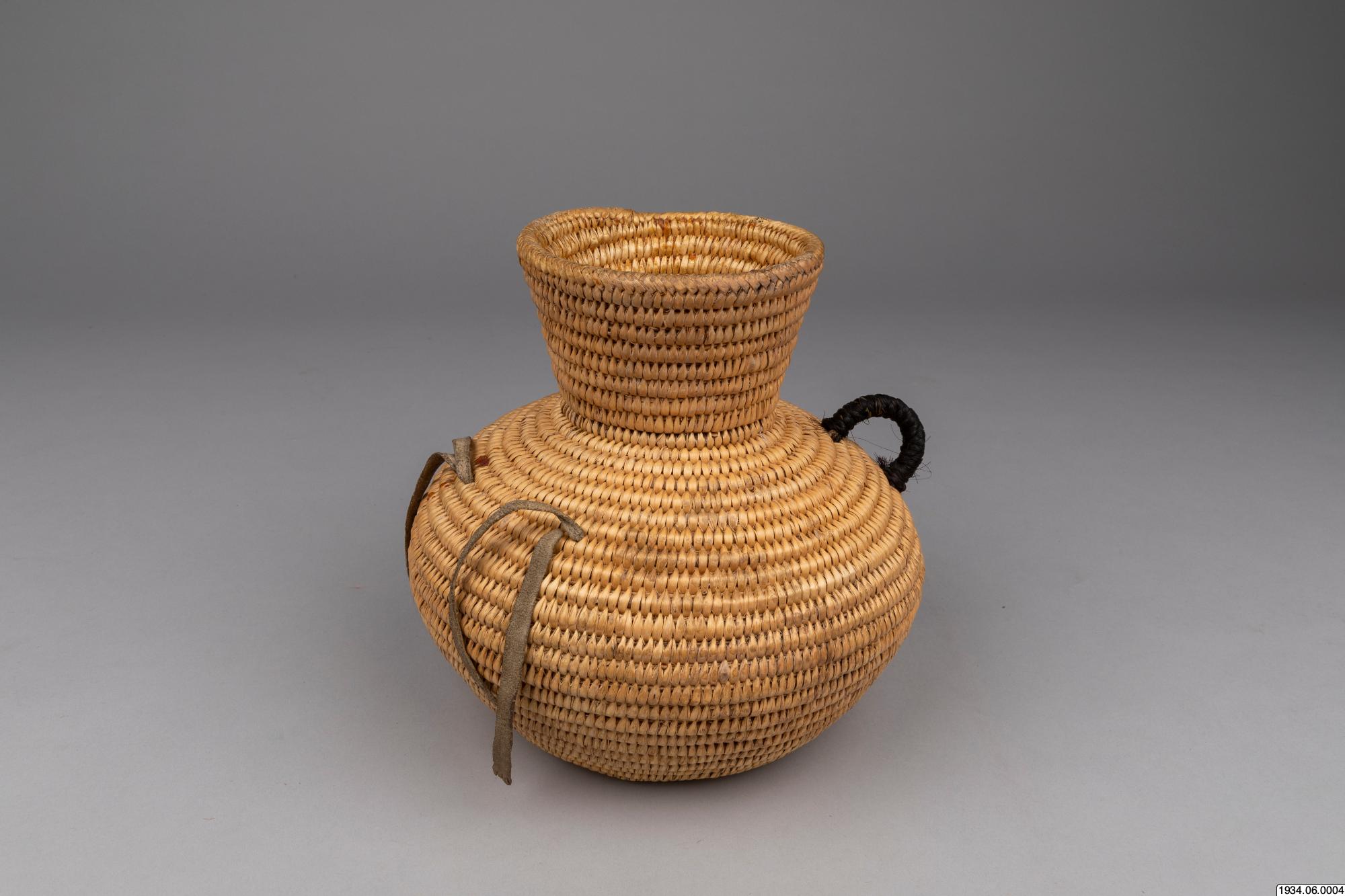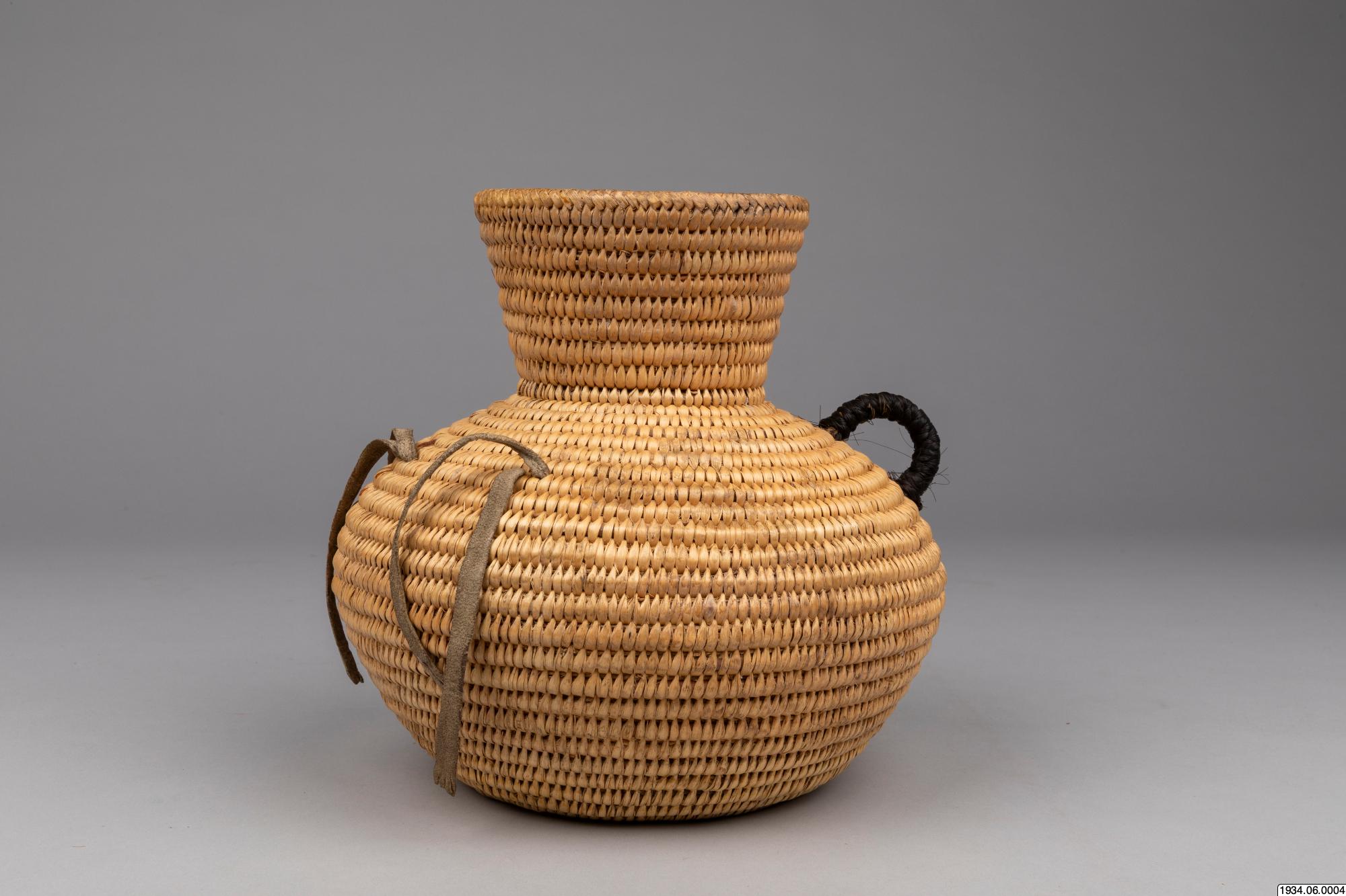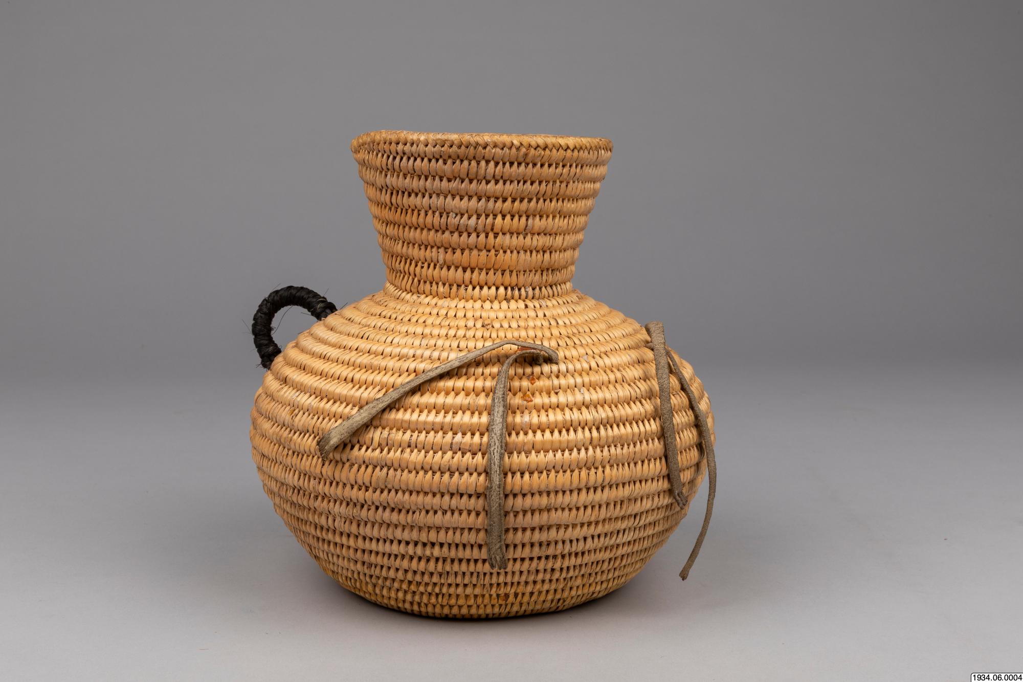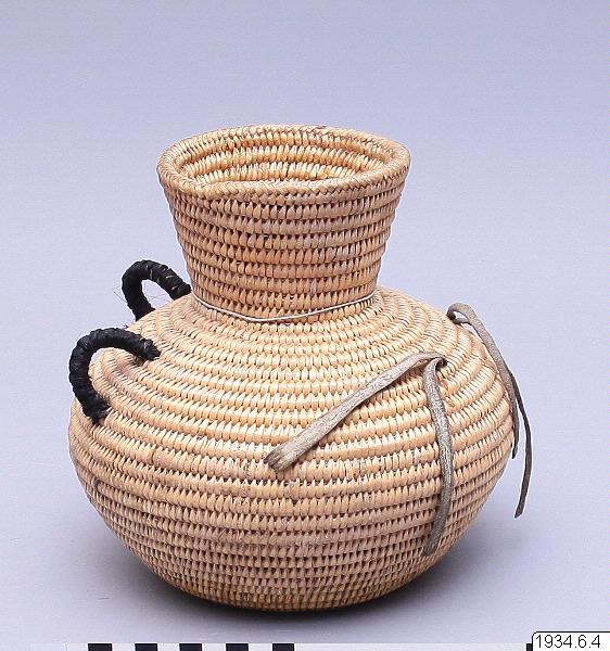 Jicarilla Apache water jar of coiled willow material lined on the inside with pitch. These water bottles were until recently made in large quantities by the Apaches and Pah-utes, and formerly were also made by the Navajos. They are water-tight and equipped with buckskin thongs and two handles for slinging on a tumpline. This ulitarian type is fast vanishing, and the present specimen, which was woven in 1932 and collected on the Jiracarilla Apache Reservation, is an unusually fine example.