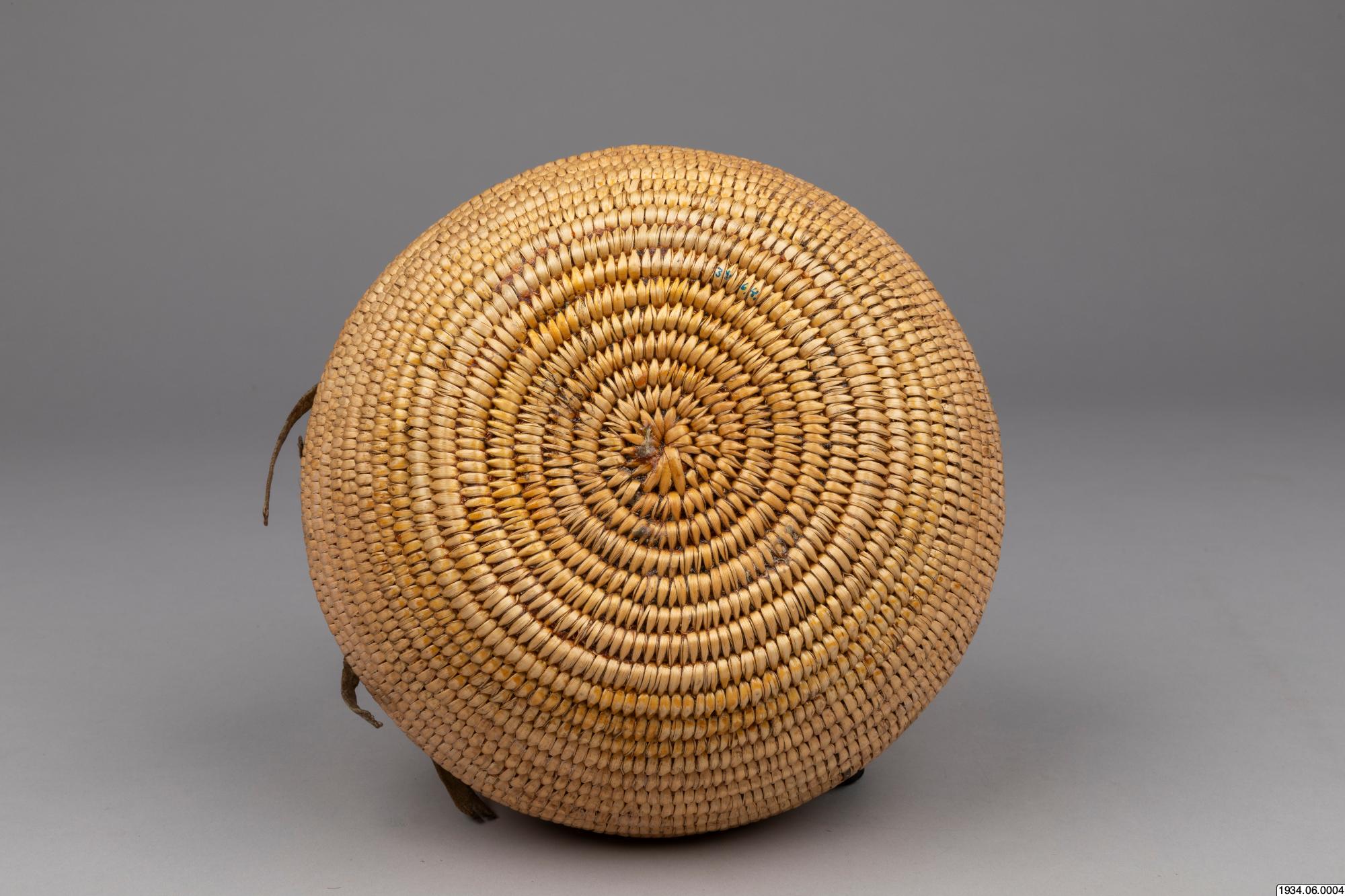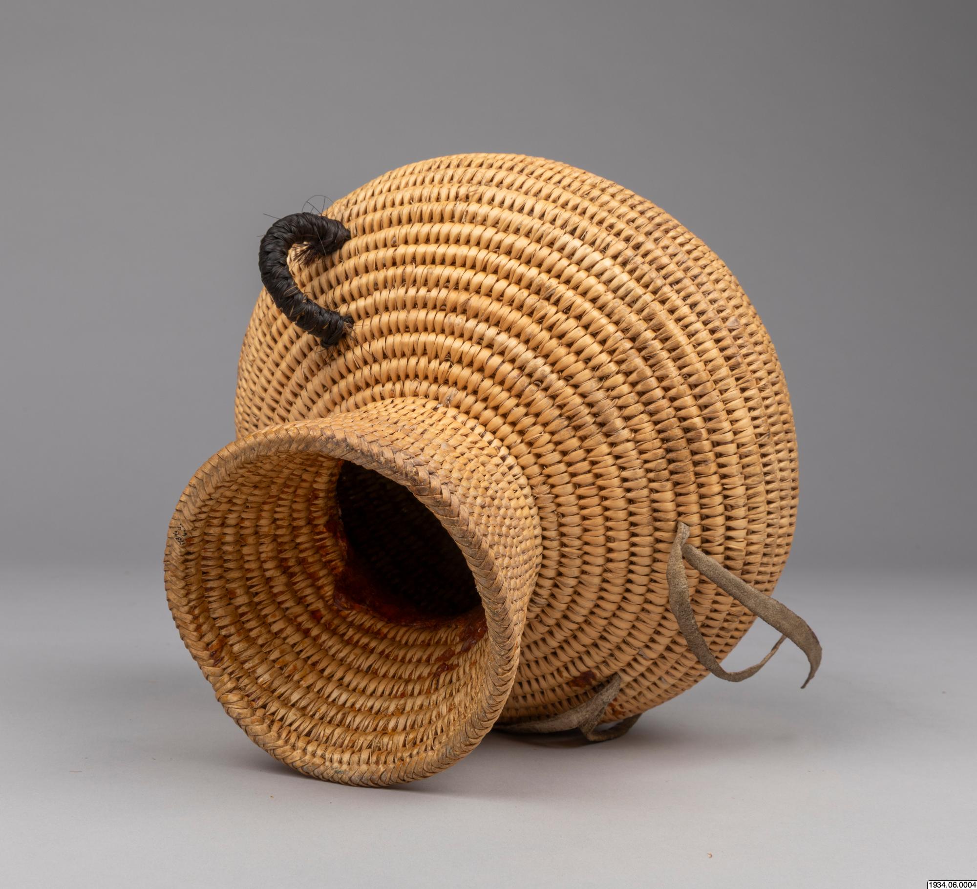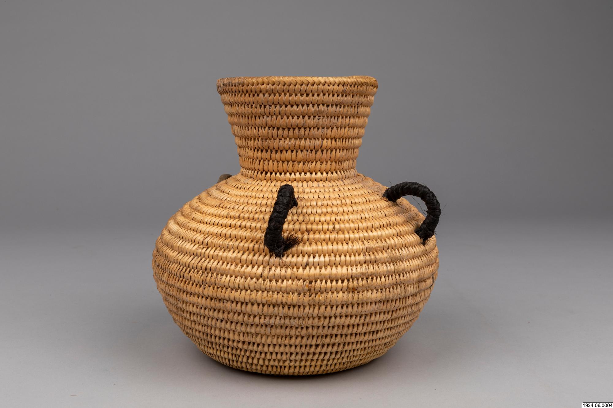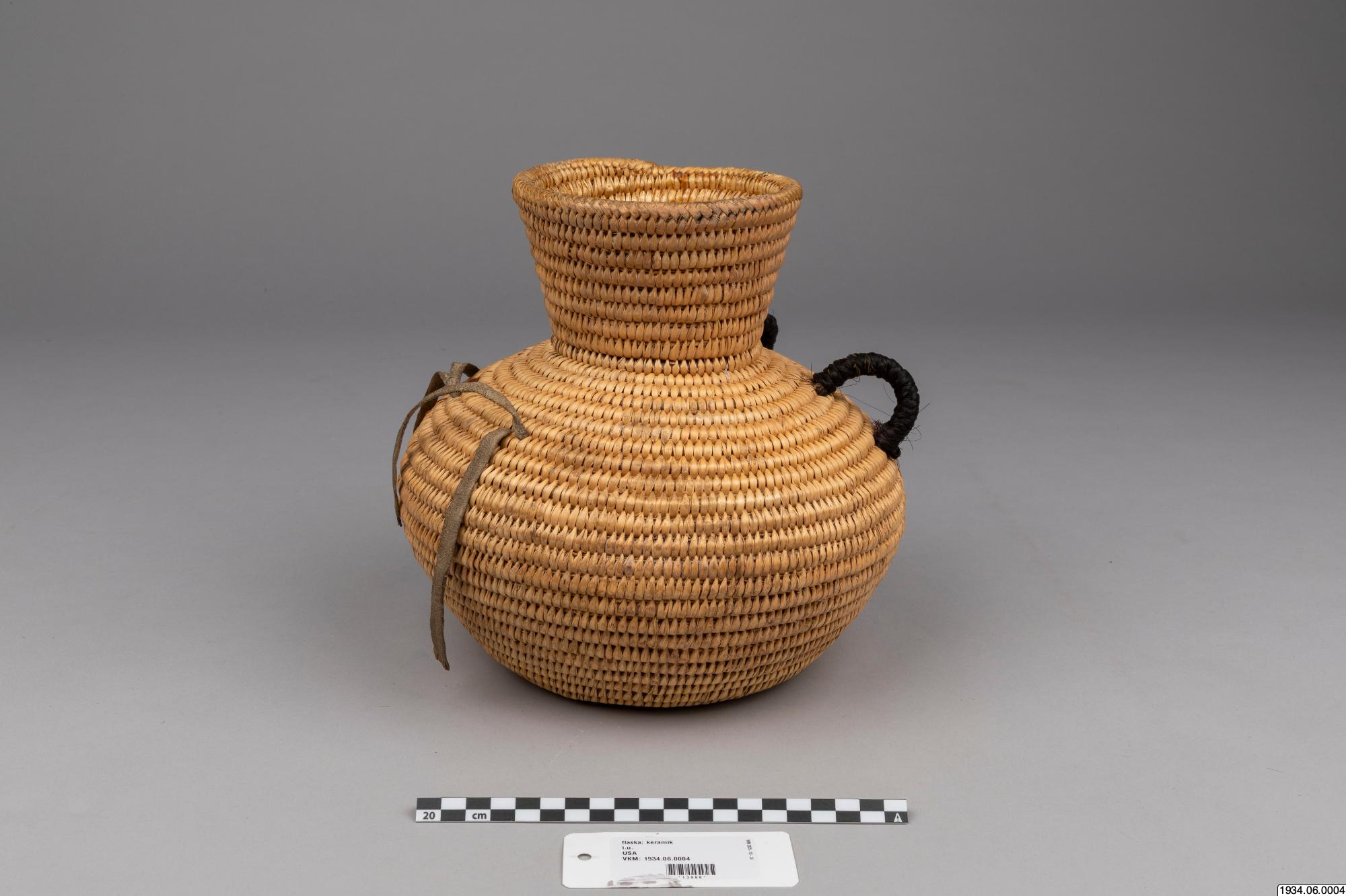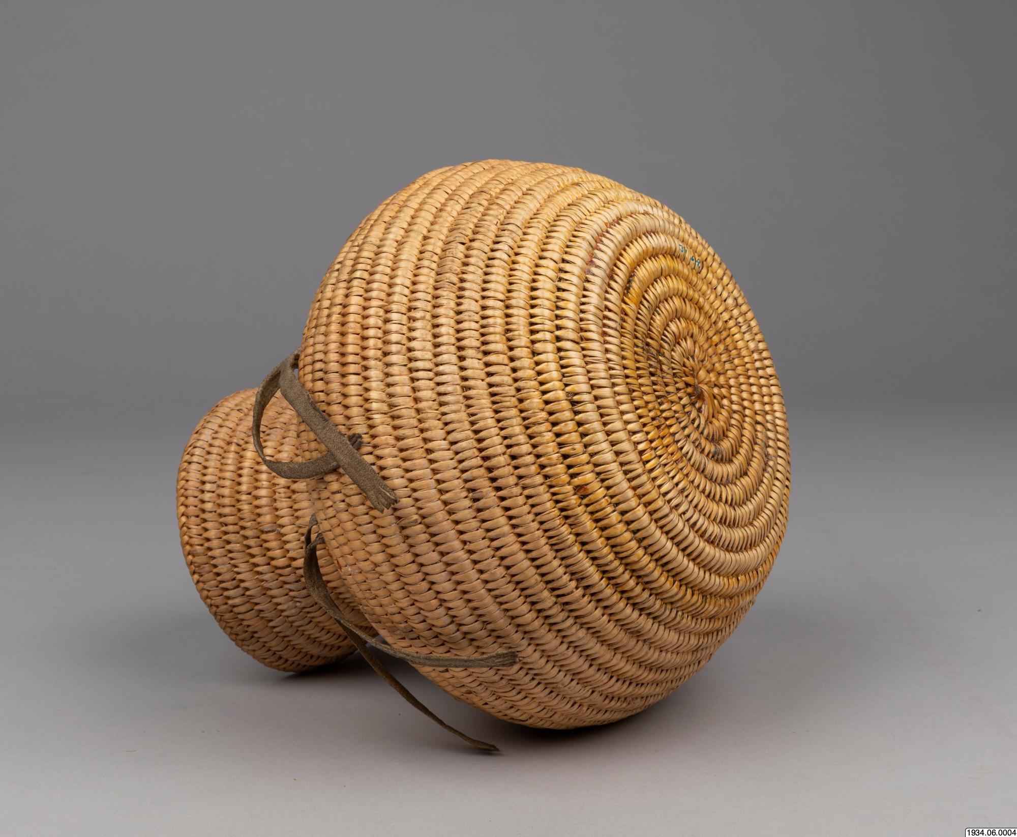 Jicarilla Apache water jar of coiled willow material lined on the inside with pitch. These water bottles were until recently made in large quantities by the Apaches and Pah-utes, and formerly were also made by the Navajos. They are water-tight and equipped with buckskin thongs and two handles for slinging on a tumpline. This ulitarian type is fast vanishing, and the present specimen, which was woven in 1932 and collected on the Jiracarilla Apache Reservation, is an unusually fine example.