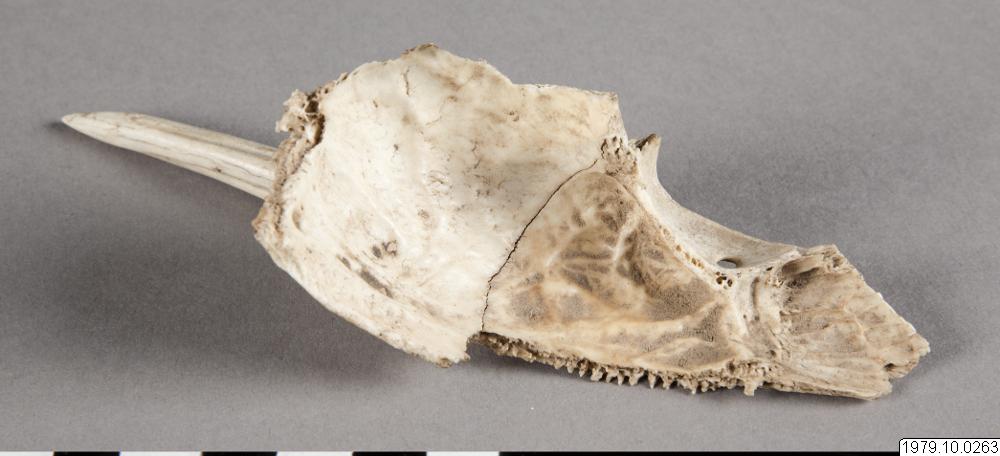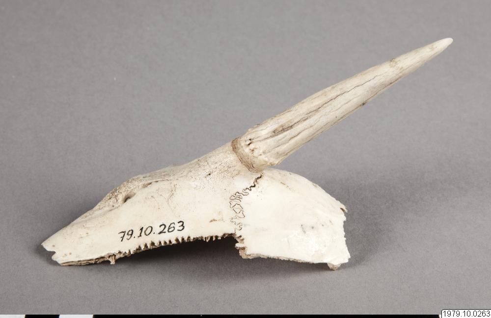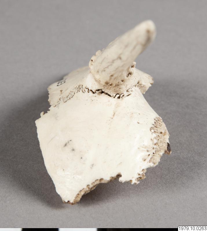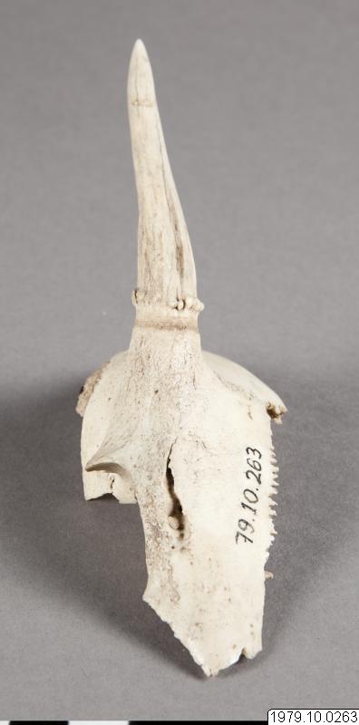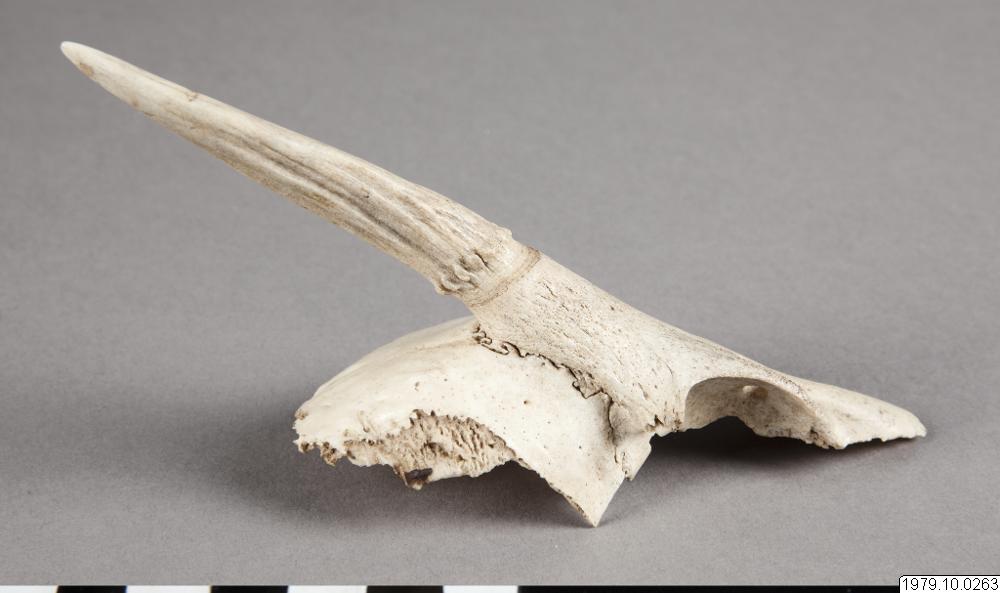 Rådjurshorn, för slagsmål. sp:-, m: tso´nakyú. Mått: L.15 cm. (katalogkort/originalbeskrivning)