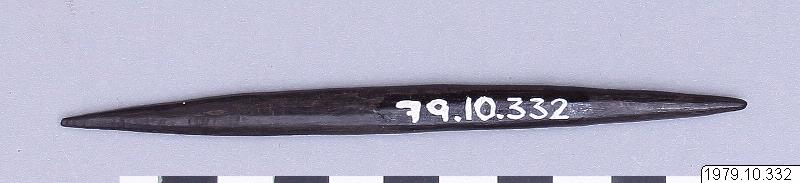Djävulspilar i set om 5 pilar i olika storlekar "waky´ayukw". (jfr 1979.10.0333-6). Sp:- m: ky´ahá. Låg i medicinmannsväskan 1979.10.0323. Mått: L. 12 cm.