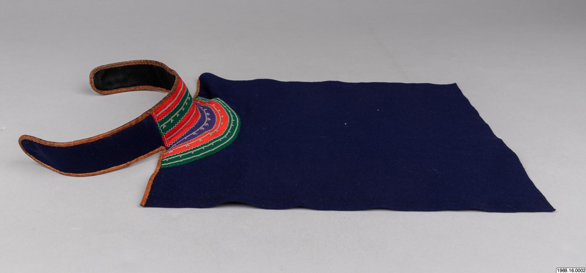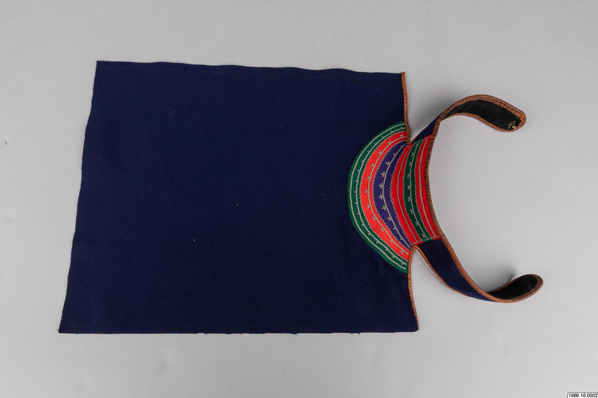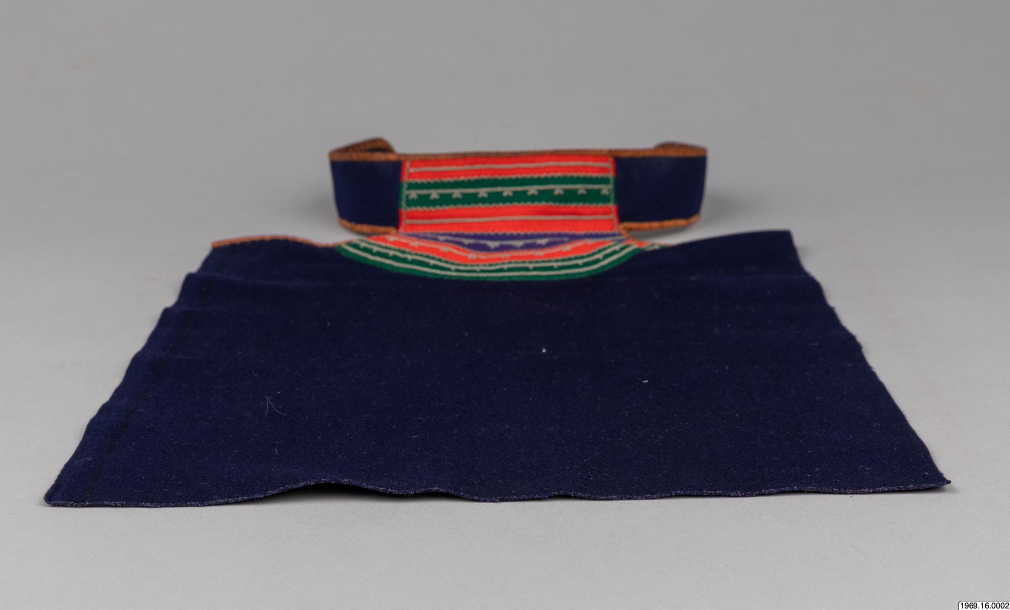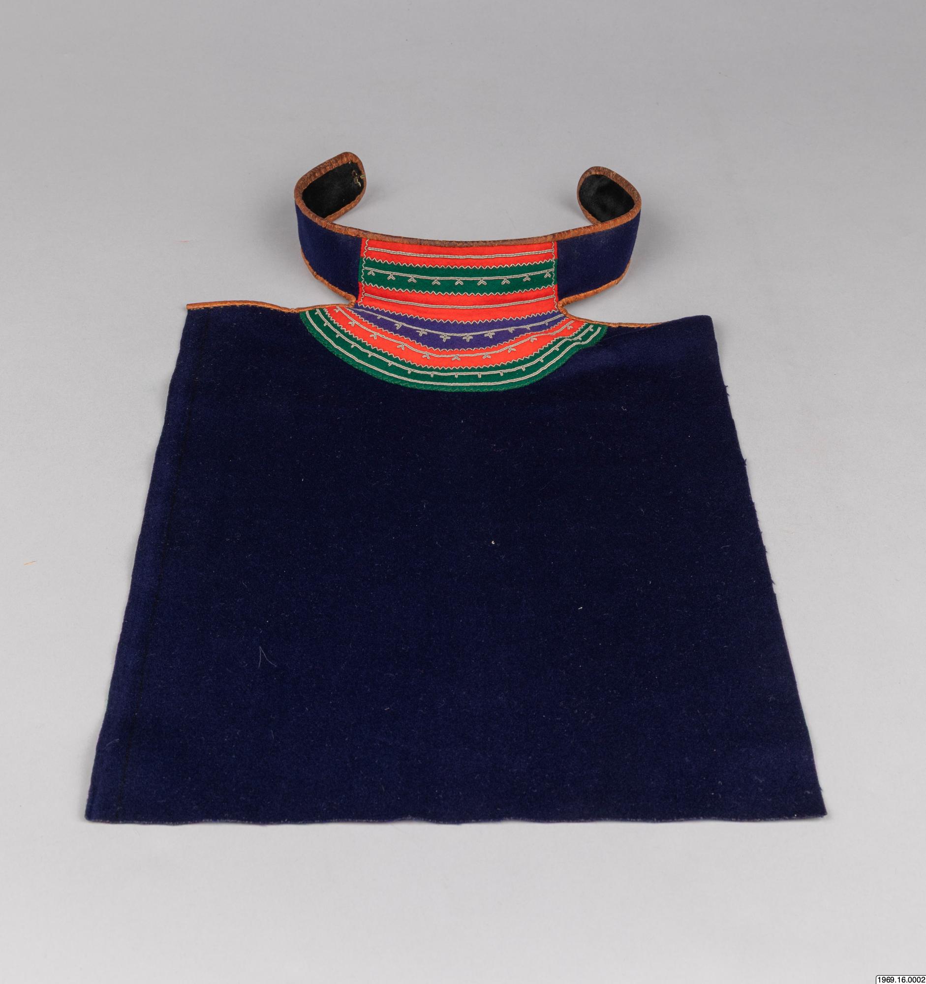 Barmkläde, av blått kläde. Besatt med rött, grönt och blått tyg (ylle) som broderats med tenntråd. De olika färgfälten avgränsas med trådbrodyr i zig-zack - mönster. Gåva av insamlaren 8/5 1969 Halsflikarna för fasthållning av barmtyget är fodrade med svart tyg, samt kantade med garevat renskinn. Mått:42 cm flikar. Barmklädet, mått: 40 cm * 29,5 resp. 42 cm, tillhör "skilk" saml.nr. 69.16.1.