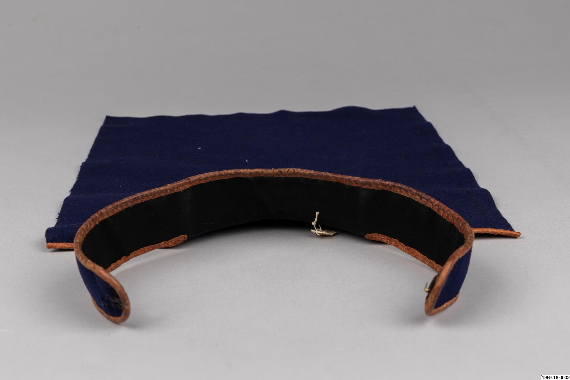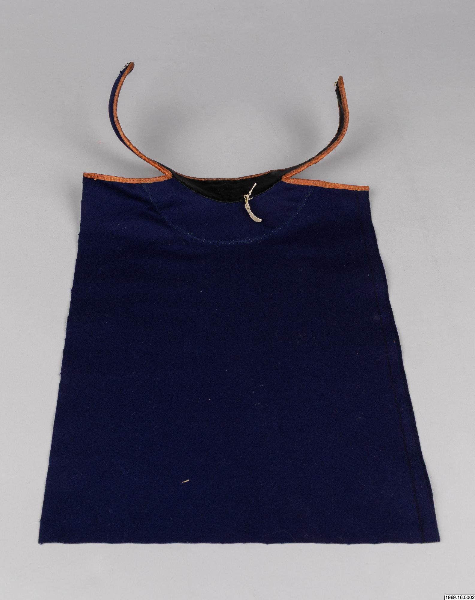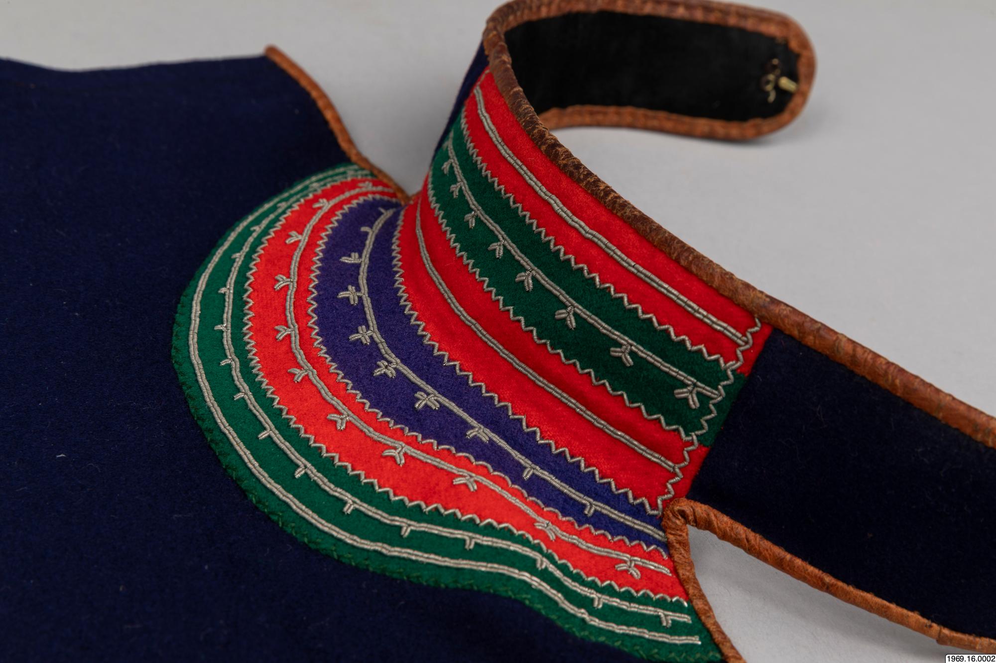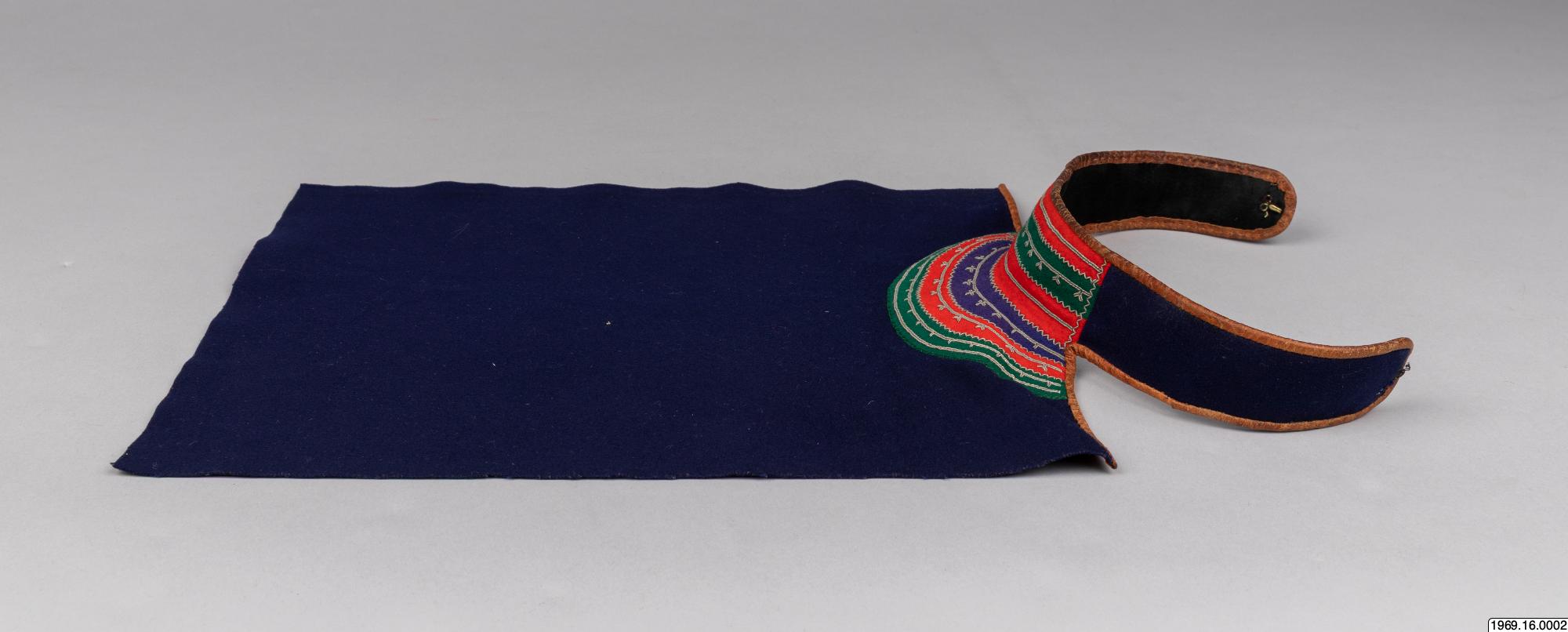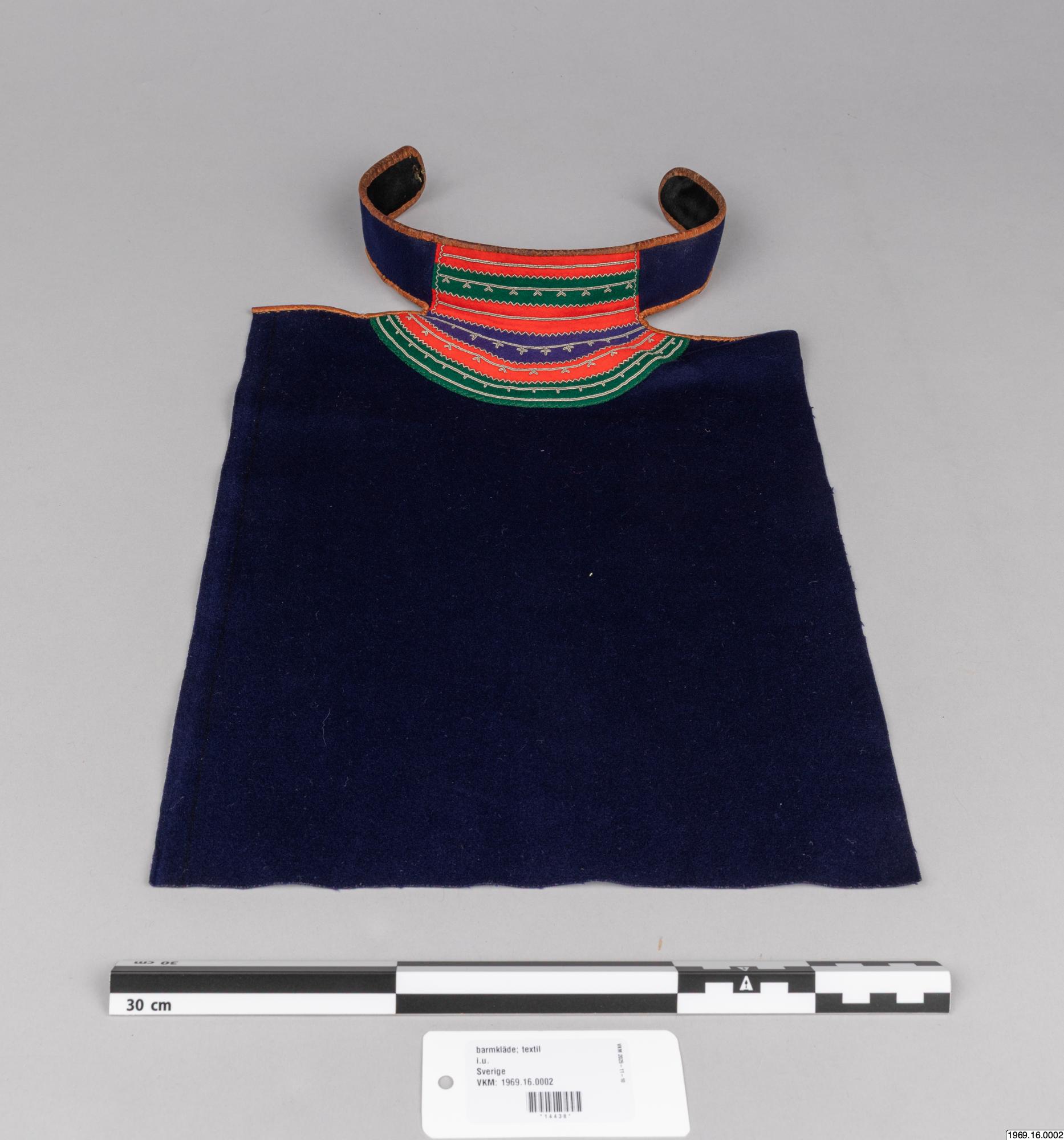 Barmkläde, av blått kläde. Besatt med rött, grönt och blått tyg (ylle) som broderats med tenntråd. De olika färgfälten avgränsas med trådbrodyr i zig-zack - mönster. Gåva av insamlaren 8/5 1969 Halsflikarna för fasthållning av barmtyget är fodrade med svart tyg, samt kantade med garevat renskinn. Mått:42 cm flikar. Barmklädet, mått: 40 cm * 29,5 resp. 42 cm, tillhör "skilk" saml.nr. 69.16.1.