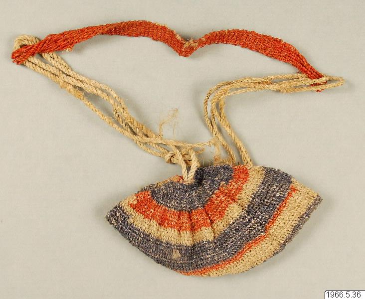 • 19,5 cm bred väska av fibermaterial, samma typ som nr 32 i samlingen. Mönstring i blått och rött samt ofärgade fibrer. Rödfärgat bärband. (katalogkort/originalbeskrivning)