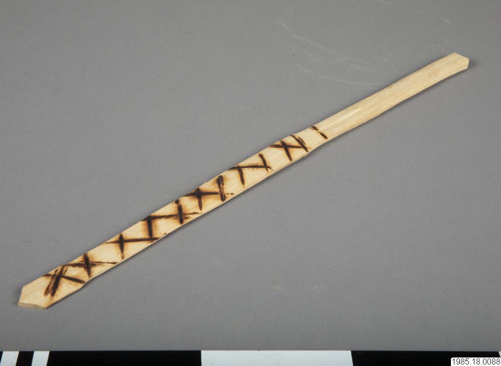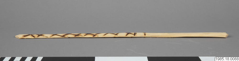 "Sprättbåge", sp: honda de madera, MN: nojwonthi´ha´ la´. Föremål som användes dels som leksak, dels som jaktredskap vid jakt på t.ex. duvor. En sten placeras högst upp på sprättbågen, den böjs bakåt och släpps sedan varvid stenen far iväg med stor kraft. L: 49 cm