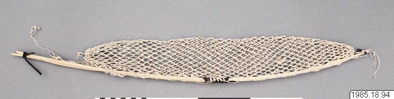 Saxnät (miniatyr), sp: red tijera, MN: tajnat. L: 69 cm. Detta individuella fisknät användes allmänt fortfarande. a-d) träpinnar, ca 32-40 cm långa, e-h) gummiband för sammanfogningar, i) fisknät av caraguatátråd, öglor ca 15 X 8 mm, j) säkerhetsbindning av dito.