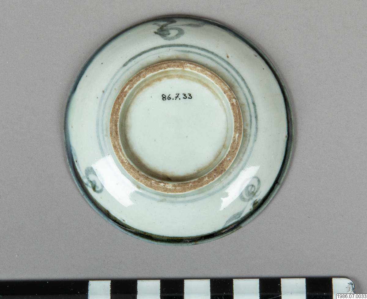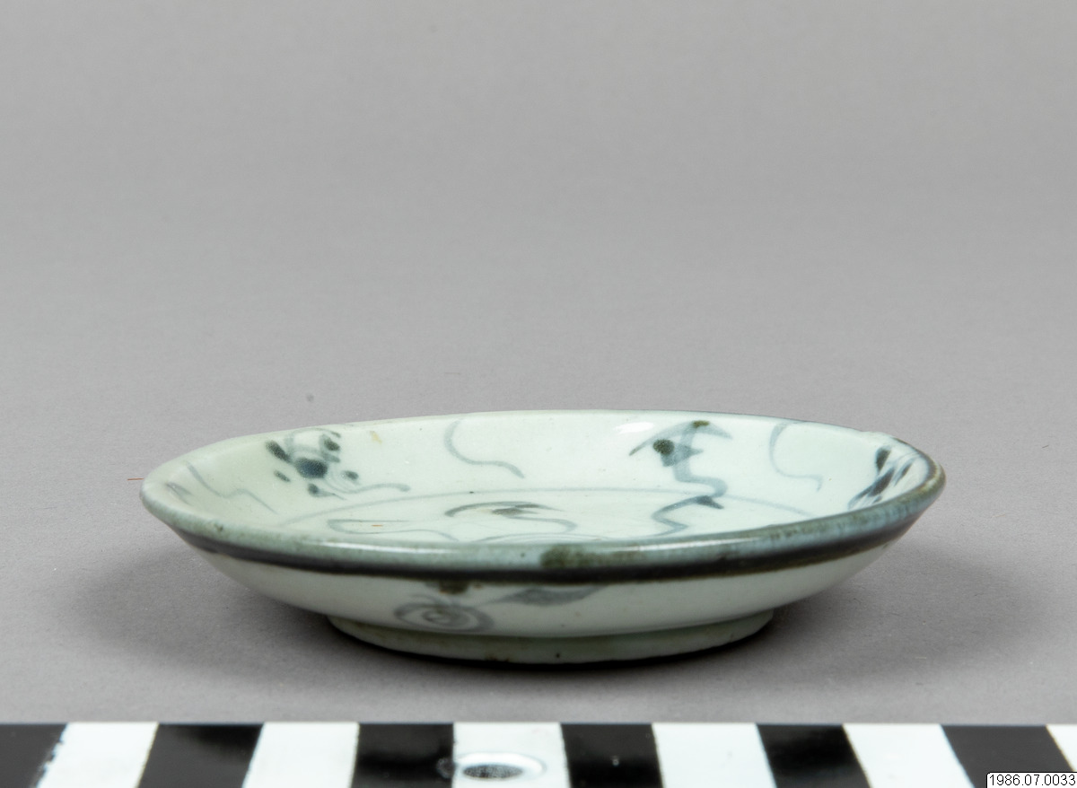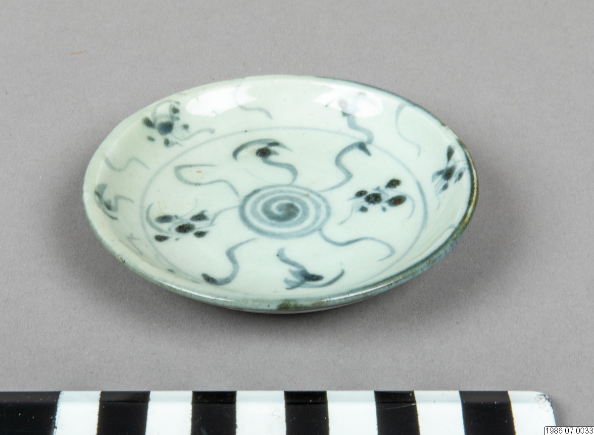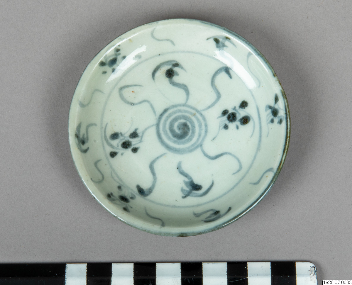 Offerskål av porslin med blå dekor.Kinesisk tillverkning.D: 9 cm