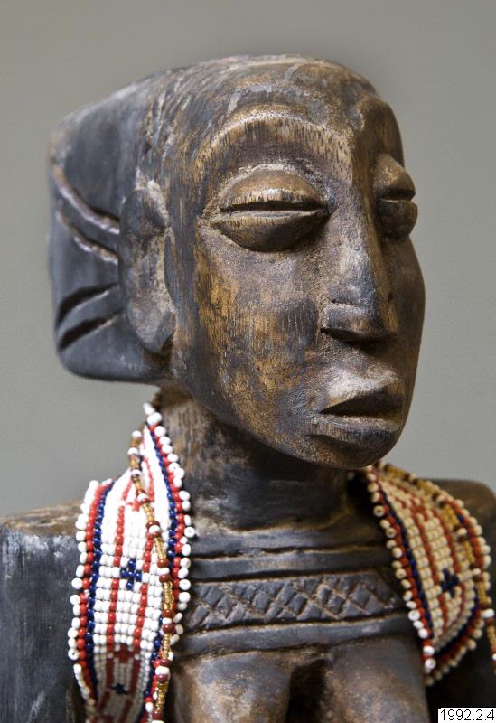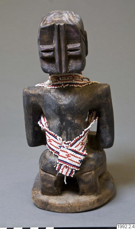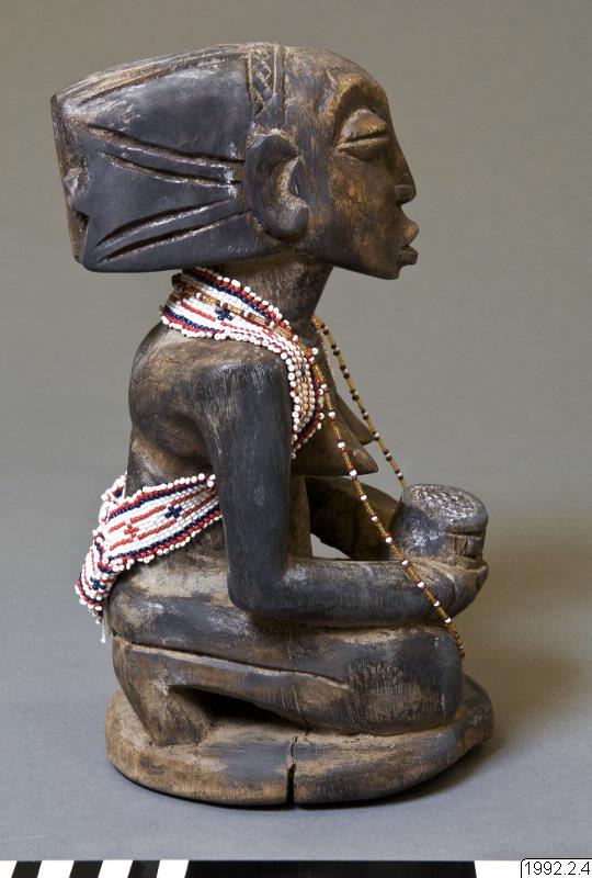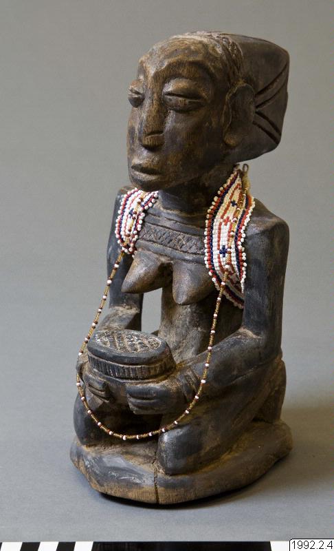 Kvinnlig skulptur i trä som sitter på hälarna och håller ett kärl i händerna. Dubbla armband på båda handlederna. Bakåt utdragen frisyr med ett kors baktill. Räfflat band skiljer håret från pannan. Ovanför brösten finns en horisontell ärrtatuering. Ett band av glaspärlor, vita, blå och röda, löper runt nacken och under armarna ner mot ryggslutet. Höjd: 26 cm