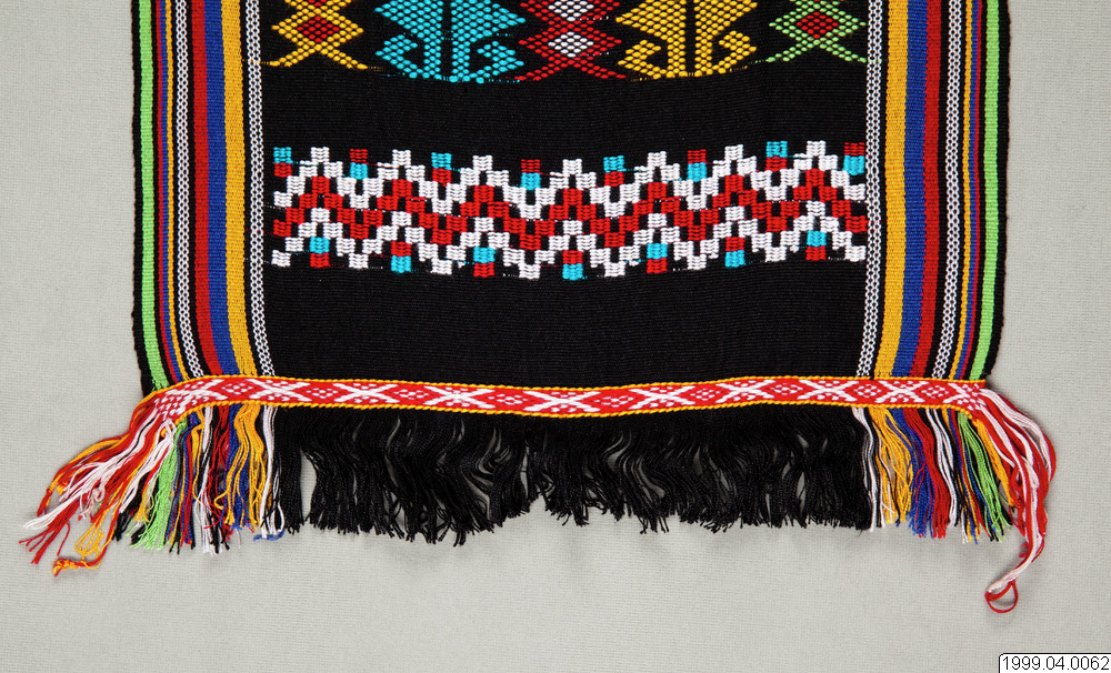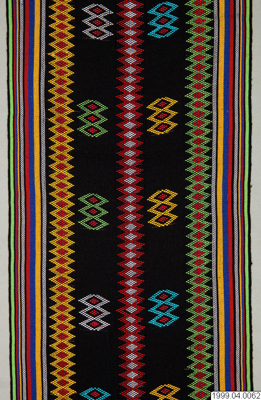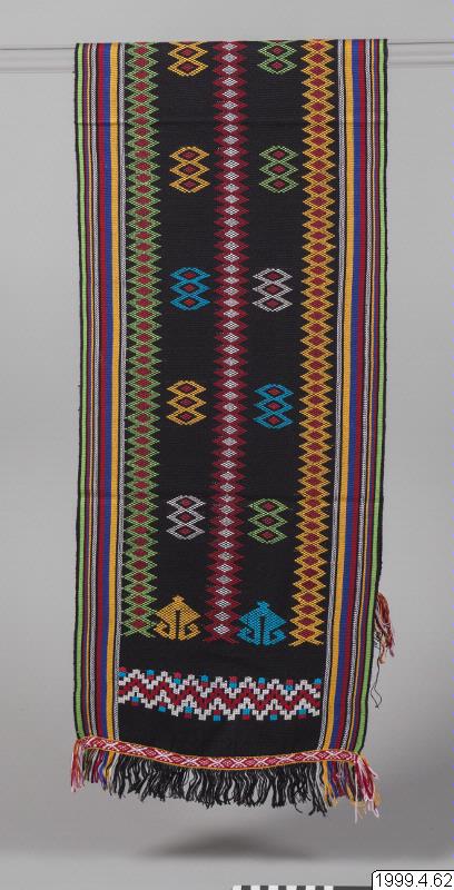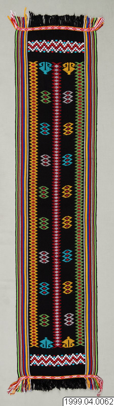 Rowa Modern huvudbonad som bärs av män, tillverkad av importerat maskinspunnet och syntetfärgat garn av rayon, på Sumba kallat benang sutera (silke). Bakgrundsfärgen är svart medan färgstarka garner valts för humbi motiven. En kombination av randig varprips och humbi teknik som är en broscherad inslagsteknik och det kodinesiska namnet på en plockväv där extra inslagsgarner bildar mönster, motiven lindas runt varptrådarna med hjälp av fingrarna, vävd av Anita Lota Kaka. Humbi motiv: Rou lugha - manihot utilissima, kassavaslingor liknas vid en ogift kvinna som utan mål krälar på marken, i stort behov av en stötta. Det sägs att hon inte kan nå ljuset som gifta kvinnor. Vem som helst kan plocka upp henne. Analogin är en av många uttalade metaforer som understryker nödvändigheten av att kvinnor gifter sig. mata karimboyo, vattenbuffelns öga, hamoli som är omegaformade guldsmycken som ingår i den del av brudpriset som brudgummens familj ska ge brudens familj som ´ersättning för flickan i faderns hus´. Formen på en hamoli anses vara densamma som på kvinnans genetalier. På en rundväv, grunden för alla sumbanesiska textilier, blir alltid ett parti ovävt. För att inte inslagen ska repas upp, på textilier som är avsedda för män, sträcks varpen i en för ändamålet avsedd bamburam och förses med dekorativa vävda avslutningsbårder, kalidir, varefter väven öppnas. Fransarna är inte tvinnade och snodda. Bårdmotiv: kahumbu, risbehållare flätad av kokospalmens blad, kadanga kadoro, ett redskap för att vinda rep och avbildas som ett stiliserat kryss. Den står för önskan att ett gift par ska arbeta nära tillsammans, att deras relation ska vara lika tät som rep på en kadanga kadoro. Köpt av Anita Lota Kaka, Waika Hoba, Homba Ronggo, Kecamatan Kodi, västra Sumba, Indonesien. Förvärvad 1999.07.29