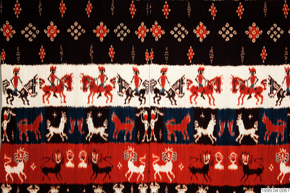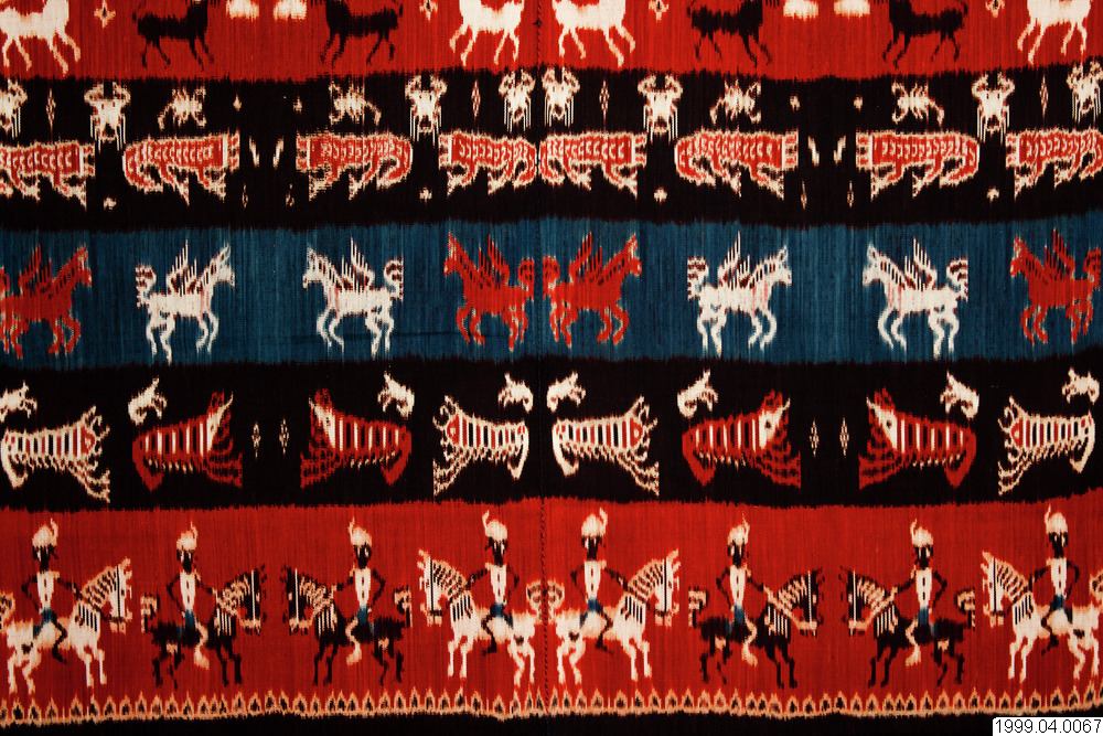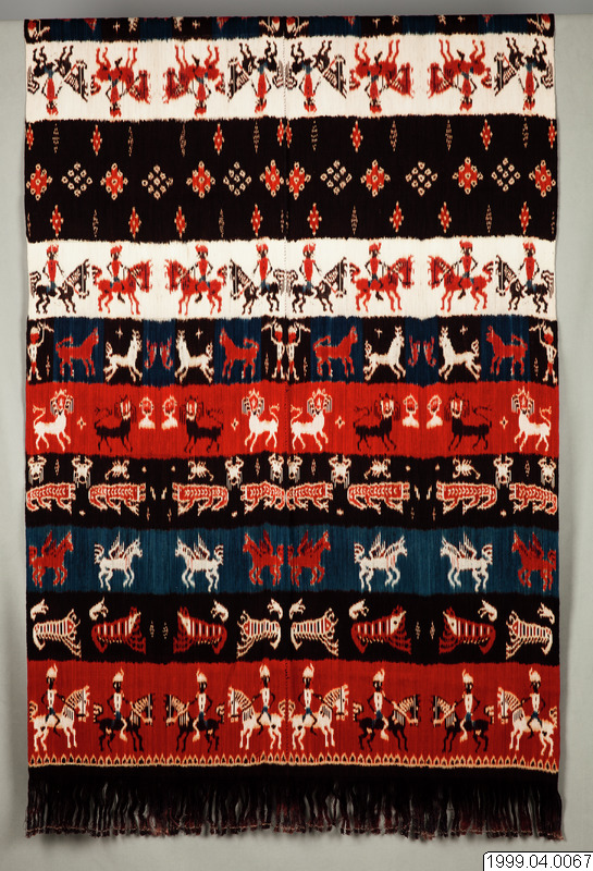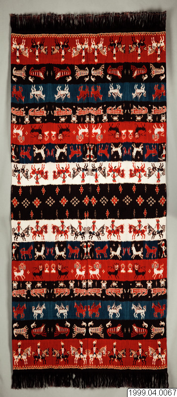 Hingi Kombu från Kaliuda, östra Sumba. Vävnadenärtillverkad av växtfärgat handspunnet garn i vackert mättade färger. Motiven på båda sidor om textilens mittparti är identiska men spegelvända. Rad 1 och 7. Motiv: Ryttare till häst. Enligt gammal tradition red folk på Hästar, (Sumbas Hästar som exporterastill andra delar av landet är berömda). Motivet längst ner ovanför fransen föreställer korgar tillverkade av bambu. Rad 2. Stora och små räkor symboliseraratt folk hjälper varandra och att de alltid är tillsammans. De stora havs räkorna som tros, byta sitt skal, för att förnya sina liv, tjänar också som en analogitill kunglig makt. Rad 3. De flygande hästarna symboliserar färden till marapu. Den döde tros färdas till häst, efter döden, för att möta sina förfäder, därför offras hästar i samband med begravningar. Rad 4. Den röda krokodilen är en analogi till kunglig makt. Liksom den djärve kungen har krokodilen bestraffningsrätt. Folk tror att krokodilen griper en skyldig man när han går över floden. De mindre motiven föreställer skorpioner och är en påminnelse om att man skall vara vaksam, om folket inte lyder kungen, tar kungen skorpioner till hjälp för att bita folket. Buffelhuvuden, buffeln är ett centralt djur för olika folkslag på Sumba, socialt, kulturellt och inte minst ekonomiskt. Värdet på en buffel mäts i storleken på dess horn, vilka indikerar status. Efter att bufflar offrats, hängs hornen upp på husens väggar som vetter mot verandan. | Rad 5. De heraldiska lejonen som kopierats från holländska vapensköldar, mynt och medaljonger symboliserar en stilig och modig man. Under kolonialtiden identifierade sig adeln med den avlägsna holländska drottningen. På så vis blev den holländska kungliga symbolen viktig för den sumbanesiska aristokratin som ett tecken på status. Mellan lejonen syns stjärnor och förfäder. Rad 6. Föreställer män med spjut, som med hjälp av hundar jagarhjortar. Traditionellt kunde bara adeln organisera hjortjakter som var en del av de heliga ritualer som hörde till torrperioden. De mindre motiven mellan hjortarna föreställer räkor. Rad 8. Motiven i vävnadens mittparti kallas buah labu och föreställer squash. Under regnperioden då tillgången på mat är knapp, blandas alltid födan med squash. (text på papper ur Amnehälls efterlämnade arkiv)
