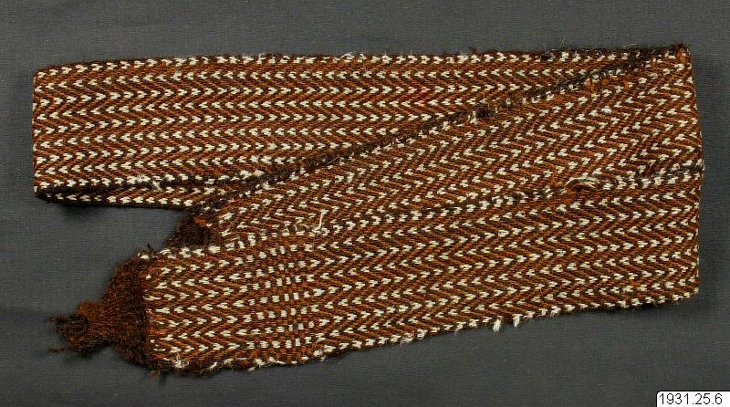 Bälte för kvinnor. Anteckn. å Metraux´s originaletikett: "Tsai", ceinture de femme. J´ai trouvé des ceintures en tout point analogue, dans le chullpas. (katalogkort/originalbeskrivning)