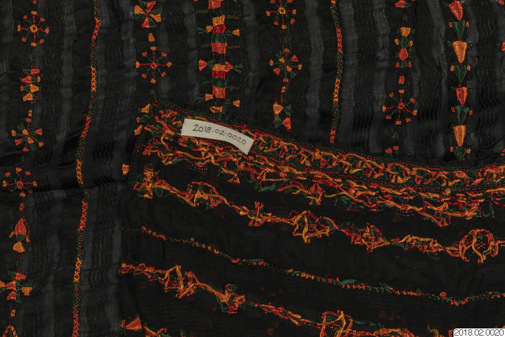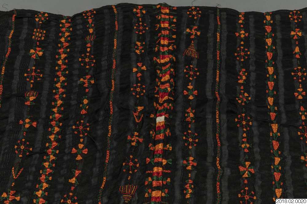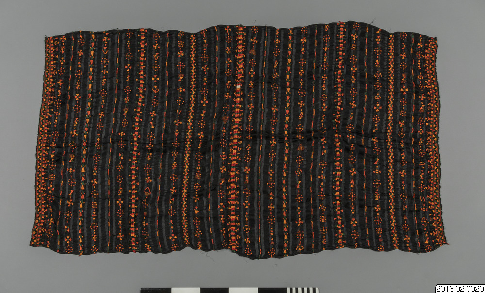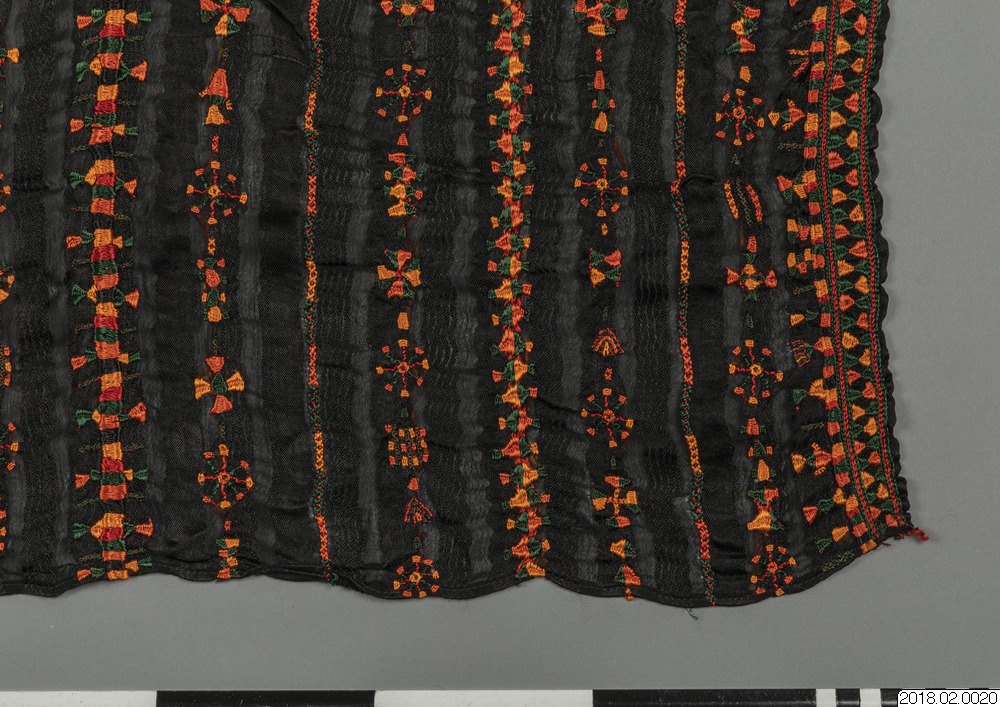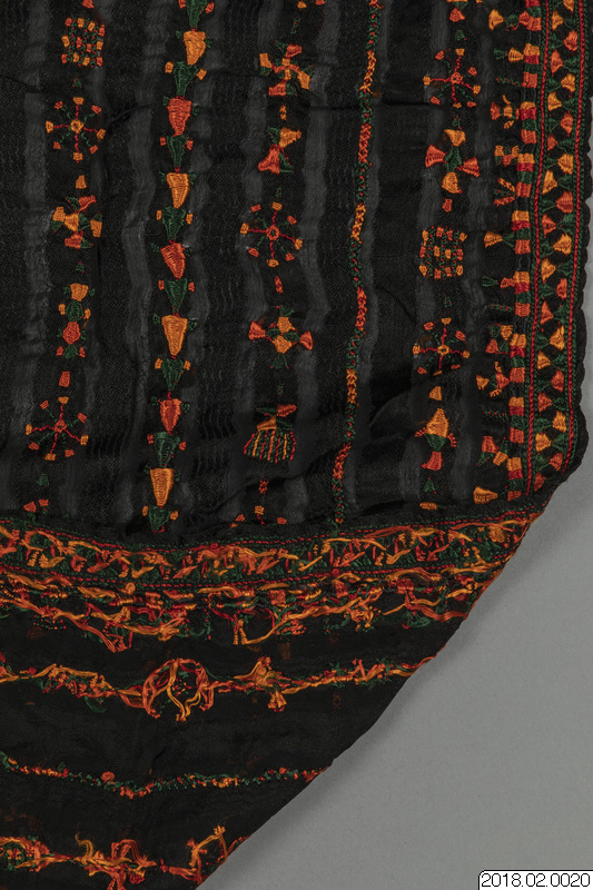 Brudschal, svart randigt syntetiskt tyg botten, Traditionell broderi m,önster, solstråle i orange, zvart, rött/brun,gult, grönt och lite vitt