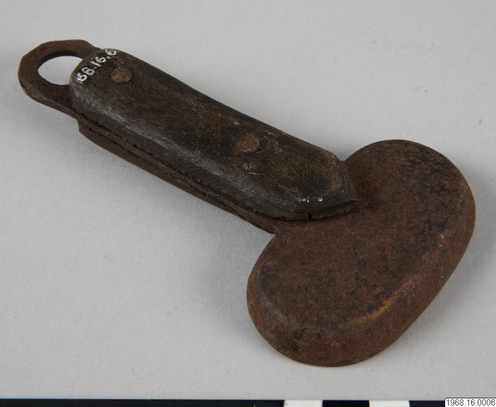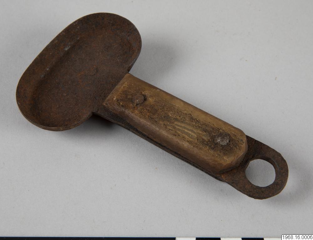 Slevformat skrapverktyg med handtag av trä och järn. Mått: 13,5 cm. Se saml. nr. 68.16.5. Insaml., : Bente Bittmann Simons År: 1967 Köp från: dito.