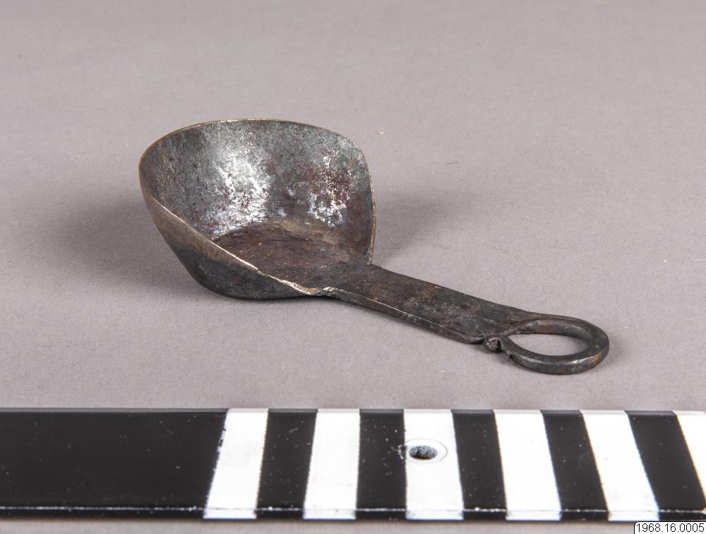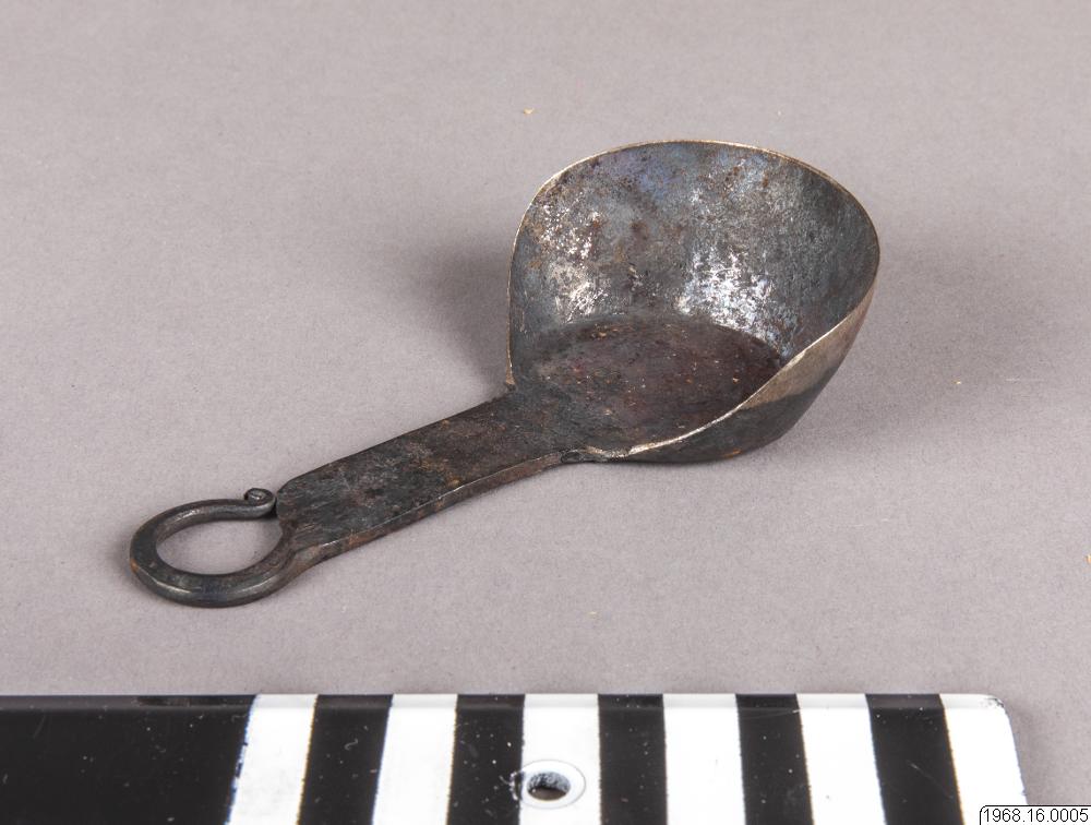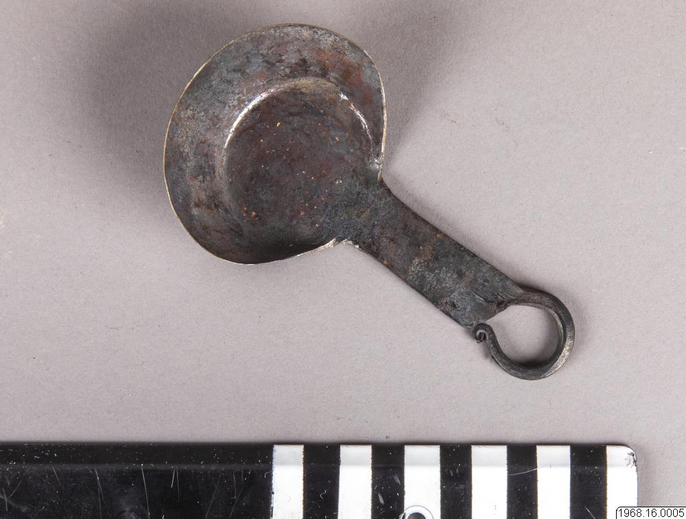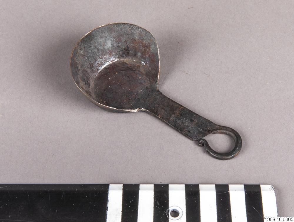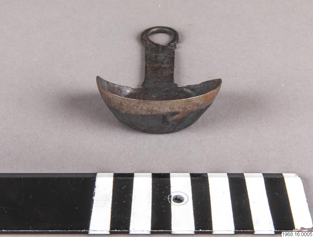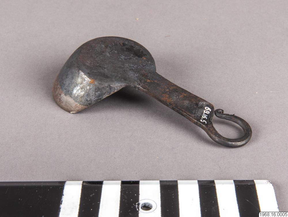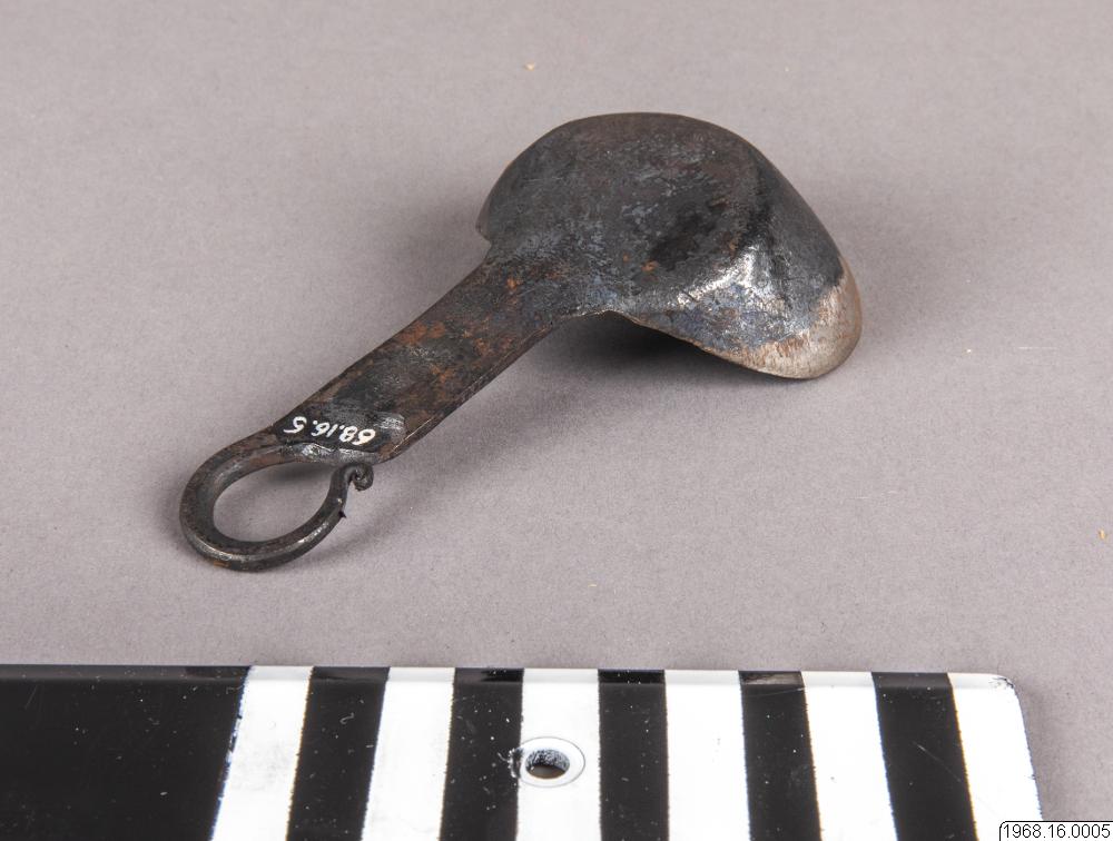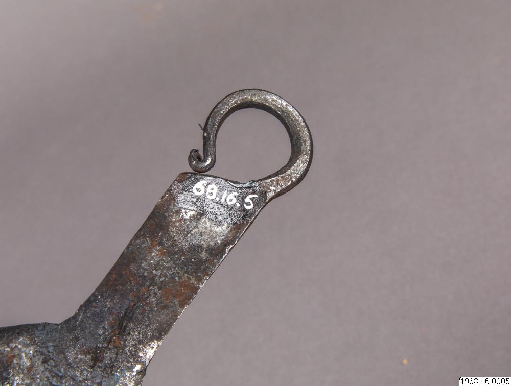 Slevformat skrapverktyg, som slutar med ögla. Mått: 13,5 cm. Om detta föremål meddelar insaml. följande: "Skraber till magueyplantan. Köbt paa markedet i Cholula. De lokale "pulquero" i Mexiko. Insaml., : Bente Bittmann Simons Köp från: dito