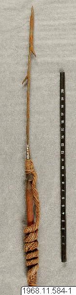 Harpun-pil. Längd: 104,5 cm. Avskjutes med båge mot vatten- och landmål. Lossnande spets, som "förankrats" med lina av rotfiber. Styrfjädrar fastsatta ett stycke in på skaftet. Järnspetsen har två, kraftiga, olikriktade hullingar. (katalogkort/originalbeskrivning)