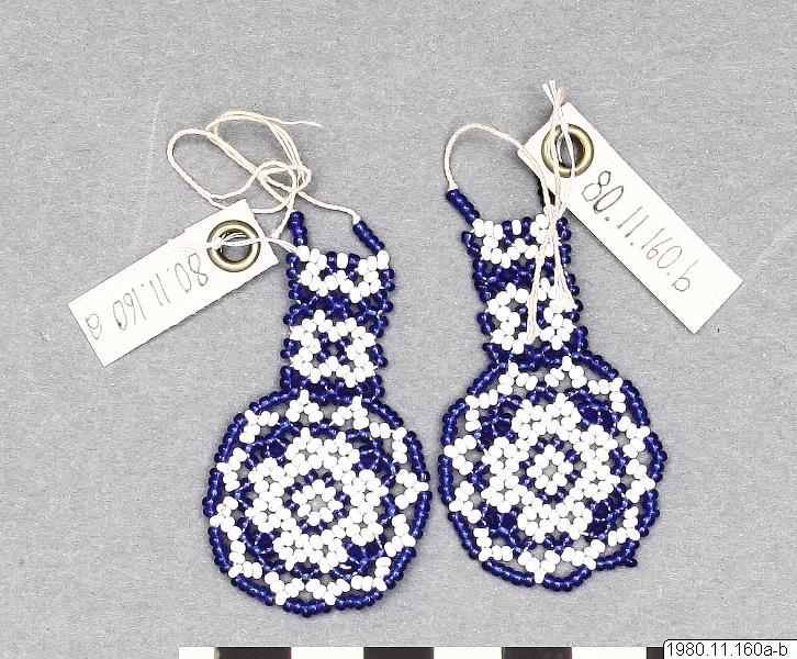 • Örhängen av blå och vita plastpärlor, uppträdda på bomullstråd, med mönster av koncentriska cirklar. L.: ca 11 cm; B.: ca 3,1 cm.