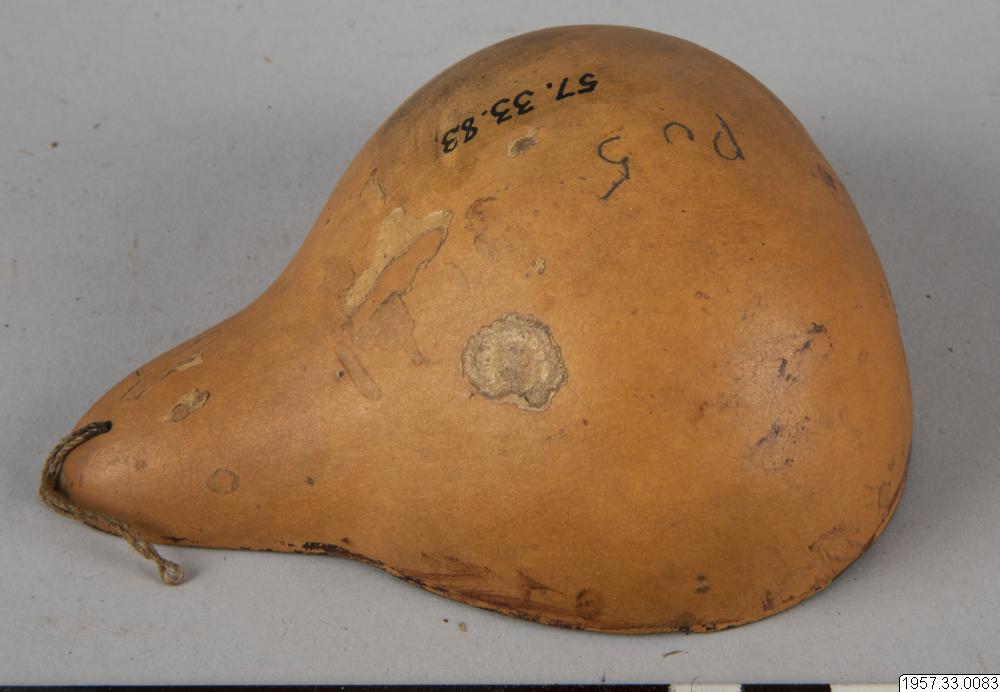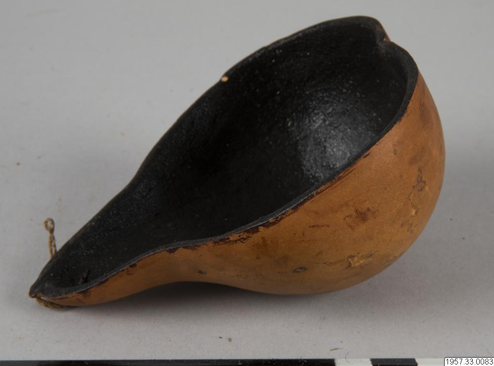 11,5 cm lång, ljus, invändigt svärtad kalebasssked med upphängningstråd. Se anm. till nr 79 i denna saml. Detta exemplar märkt dels Pu 5. Köpt av: Fru Ester Bolinder 1957, bet. jan. 1958.