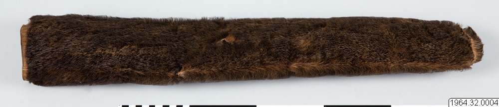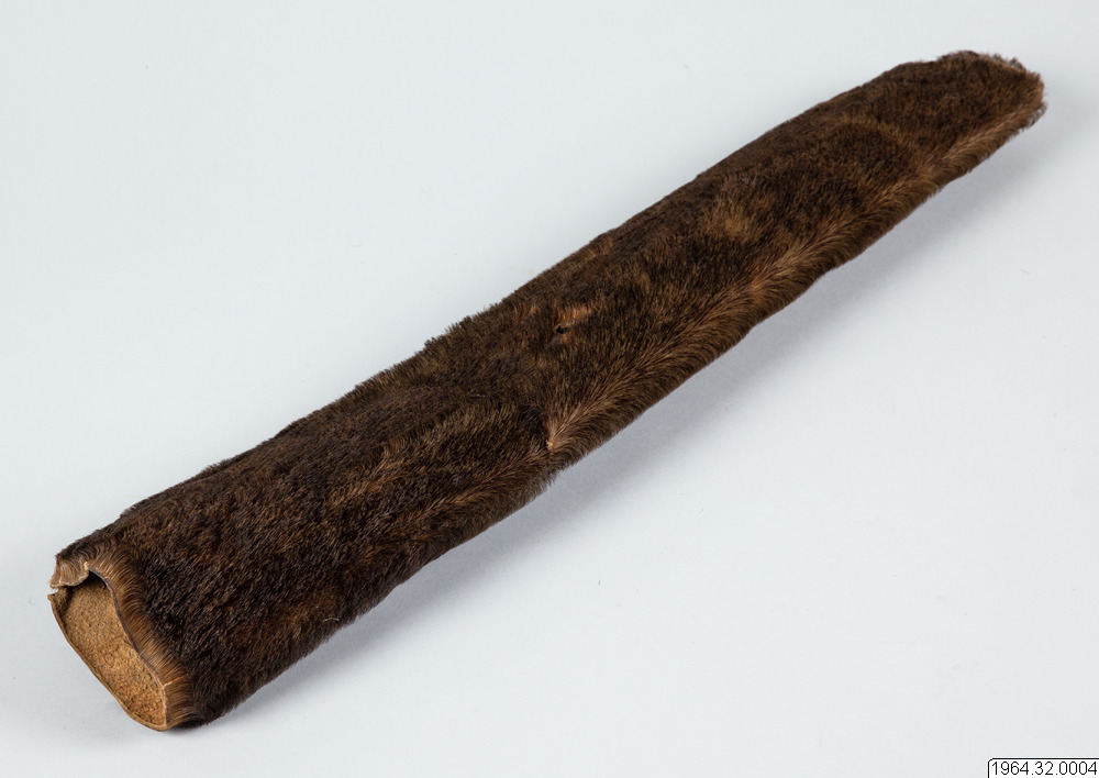 71 cm långt, 10-14 cm brett koger av sjölejonskinn för pilar. För en beskrivning av ett sådant koger se Martin Gusinde: "Die Feuerland-Indianer", I, Mödling bei Wien,1931, fig. 37, text sid. 240-241. Jfr uppgifterna till nr 1. Gåva av kommendörskapten och fru N.A Sunde, Karlskrona 1964.