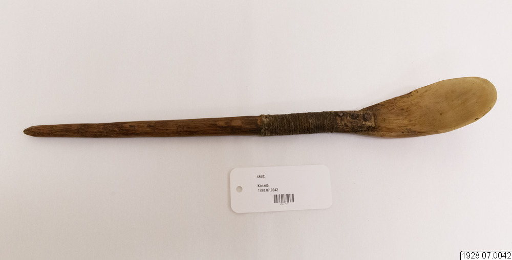 Sked med vilken man tar bort issörja och snö i andningshålet. Skeden av myskoxhorn och trä. Byte med Nationalmuseum, Köpenhamn (katalogkort/originalbeskrivning)