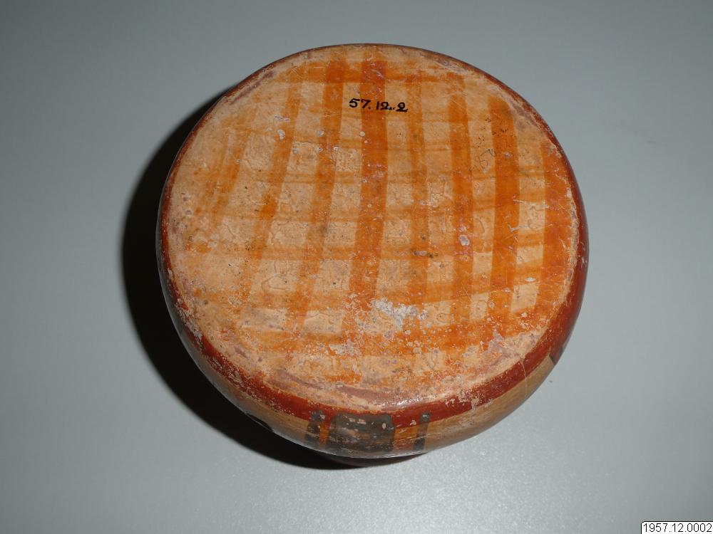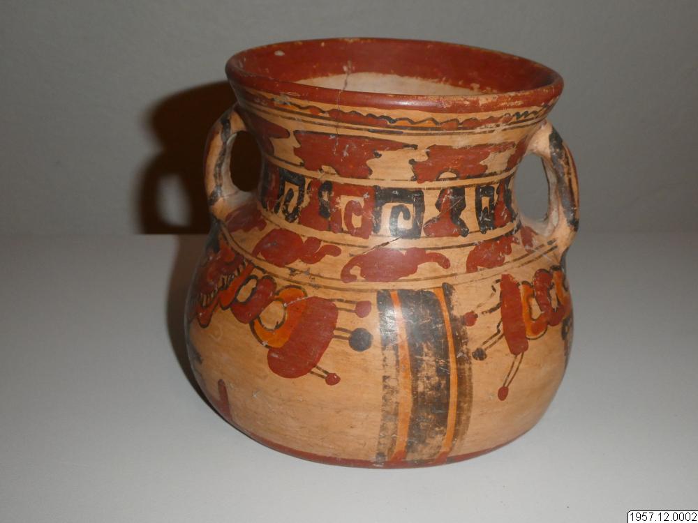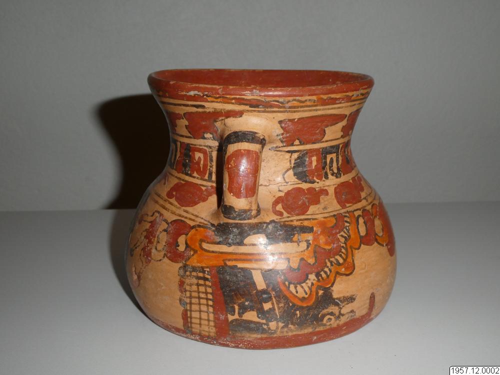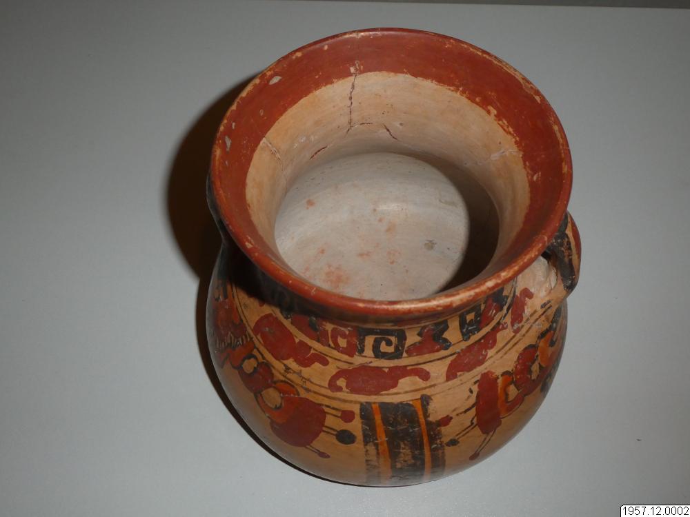 Lerkärl med brunröd, svart och orange dekor på beigefärgad yta. Orangefärgen i form av rutmönster på kärlets ytterbotten. Vertikalställda öron, insvängt mittparti och utsvängd öppning. Öppningsdiamer 11,5 cm, höjd 12,4 cm (saml.:ns orig.nr. 284).
