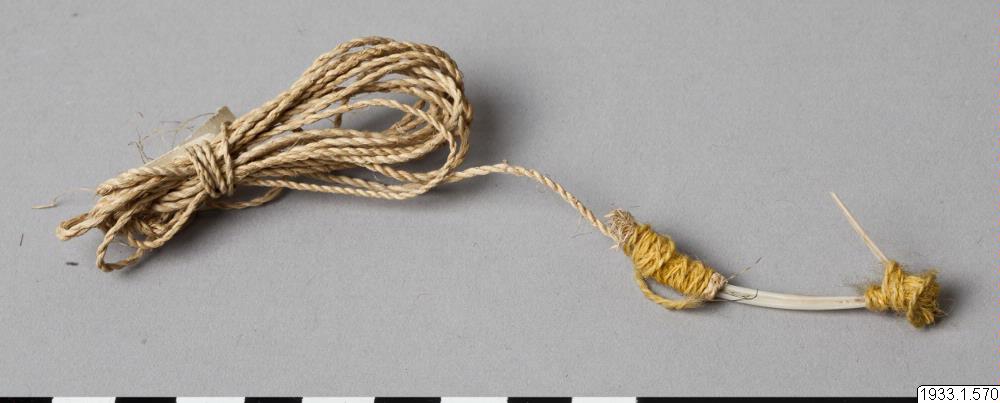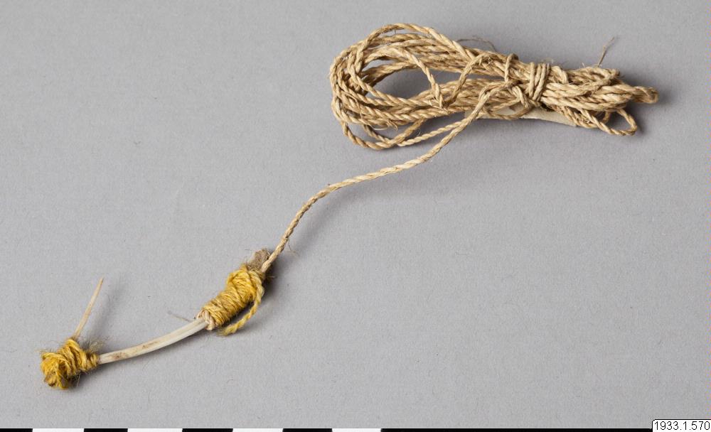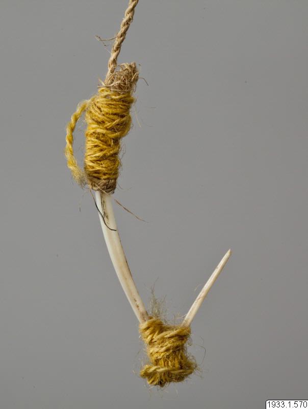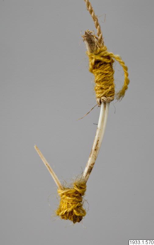 Metkrok av ben. Nygjord för att visa utseendet av de gamla metkrokarna. Gåva. (katalogkort/originalbeskrivning)
