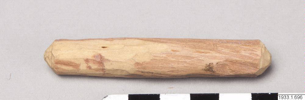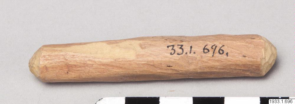 Magiskt trästycke. Några indianer har dylika trästycken gömda. De påstår att Payiak (ond ande) har sin bostad i detsamma. De som lida av reumatism tro sålunda att någon som är i besittning av ett dylikt trästycke sagt till det, att dess Payiak skall gå och orsaka värken. (katalogkort/originalbeskrivning)