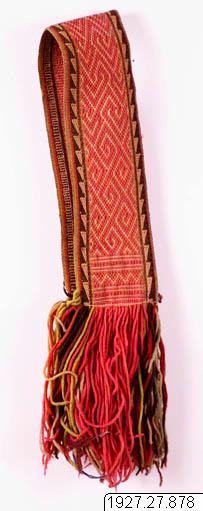 Referat från orginalkort: " Turbante " kurkin mora". Se usan los hombres y ninos; nunca mujeres y ninas. Se puede usar cualquier hombre y nino sin distincio´n. Los hilos que se usan ahora son comprados de los extrangeros, pero antes hacián de algodo´n y tenián en los jugos de ciertas plantas. Los que construyen son hombres y mujeres." Material varp ull 4-tr S-tvin lj.grön, röd, bege, m. grön, lila, b. röd, 30 tr/cm bastfiber 6-tr ? Z-tvin ofärg. inslag bastfiber 2-tr ? S-tvin ofärg. 9 tr/cm Teknik Väv, varprips, varpmönstrad. Väven börjar och slutar med en kedjerad. Ullgarnerna bildar en obearbetad frans, bastfibrerna avklippta, ej med i fransen. Mönster Diagonala linjer som bildar krokar.