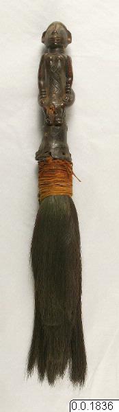 Smutsig. Skaftet har spruckit och infästningarna har bitvis lossnat från tageldelen. Mellan figurens ben finns en mörkbrun torkad massa, som det finns mekaniska skador i. Tidigare lagning? [[från utst...