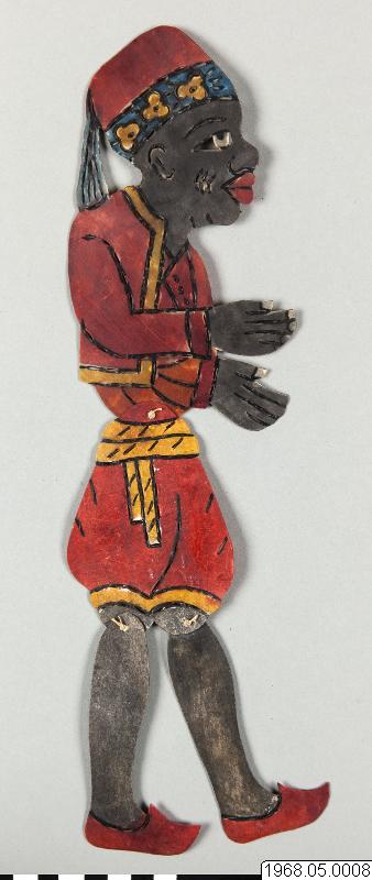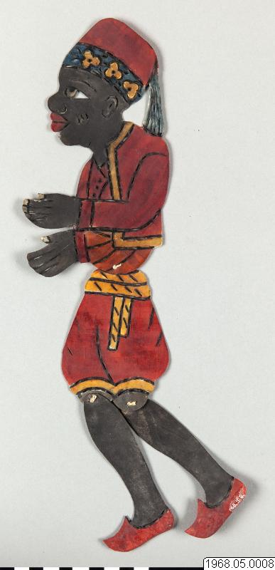 Skuggspelsfigur av läder. Består. Består av flera stycken som är sammanbundna med snöre. Målad på båda sidor i bl.a rött, blågrönt och svartgrått. mansfigur. Höjd: 35 cm. Förekommer i Karagöz, det turkiska skuggspelet. Litt.: Alain Jeanneret: Schattenspiele, Basel 1968. Pp. 20-23