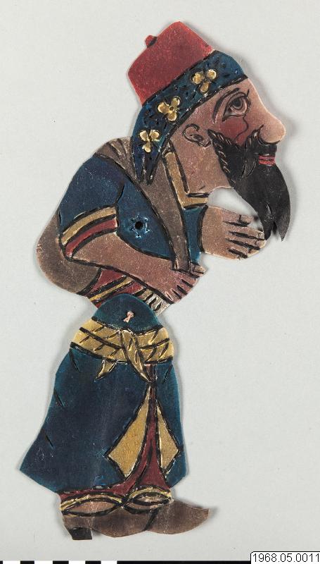 Skuggspelsfigur av läder. Består av två stycken som är sammanbundna med snöre. Målad på båda sidor i bl.a. grönt, gult, rött och svart. Höjd: 31,5 cm. På figuren finns ett hål som förstärkts med en bricka med ett hål i. I denna hålles en käpp. Figuren förekommer i Karagöz, det turkiska skuggspelet. Litt.: Alain Jeanneret: Schattenspiele, Basel 1968. Pp. 20-23