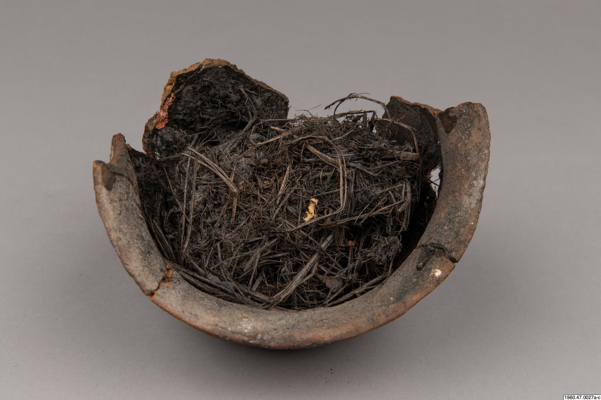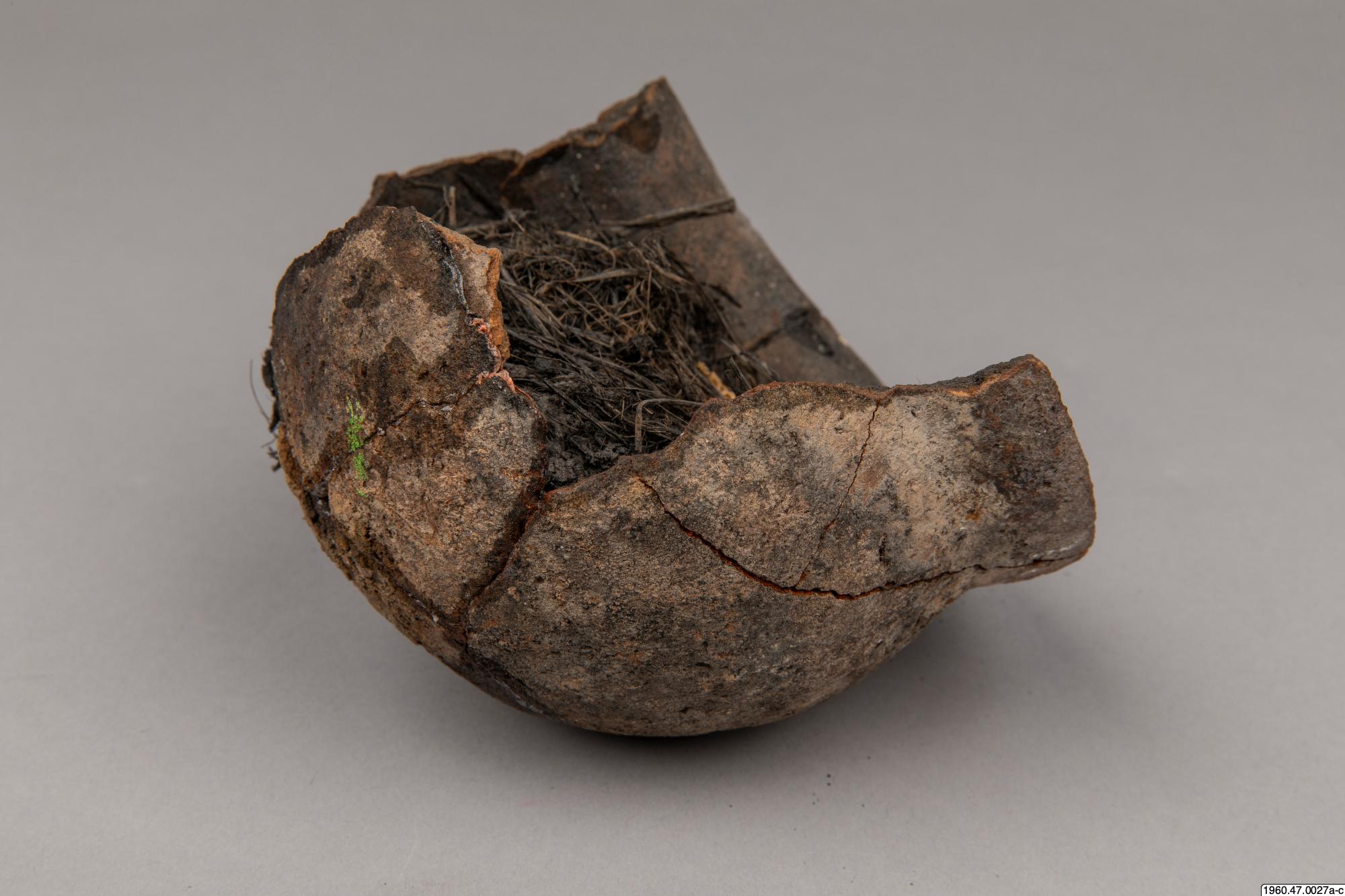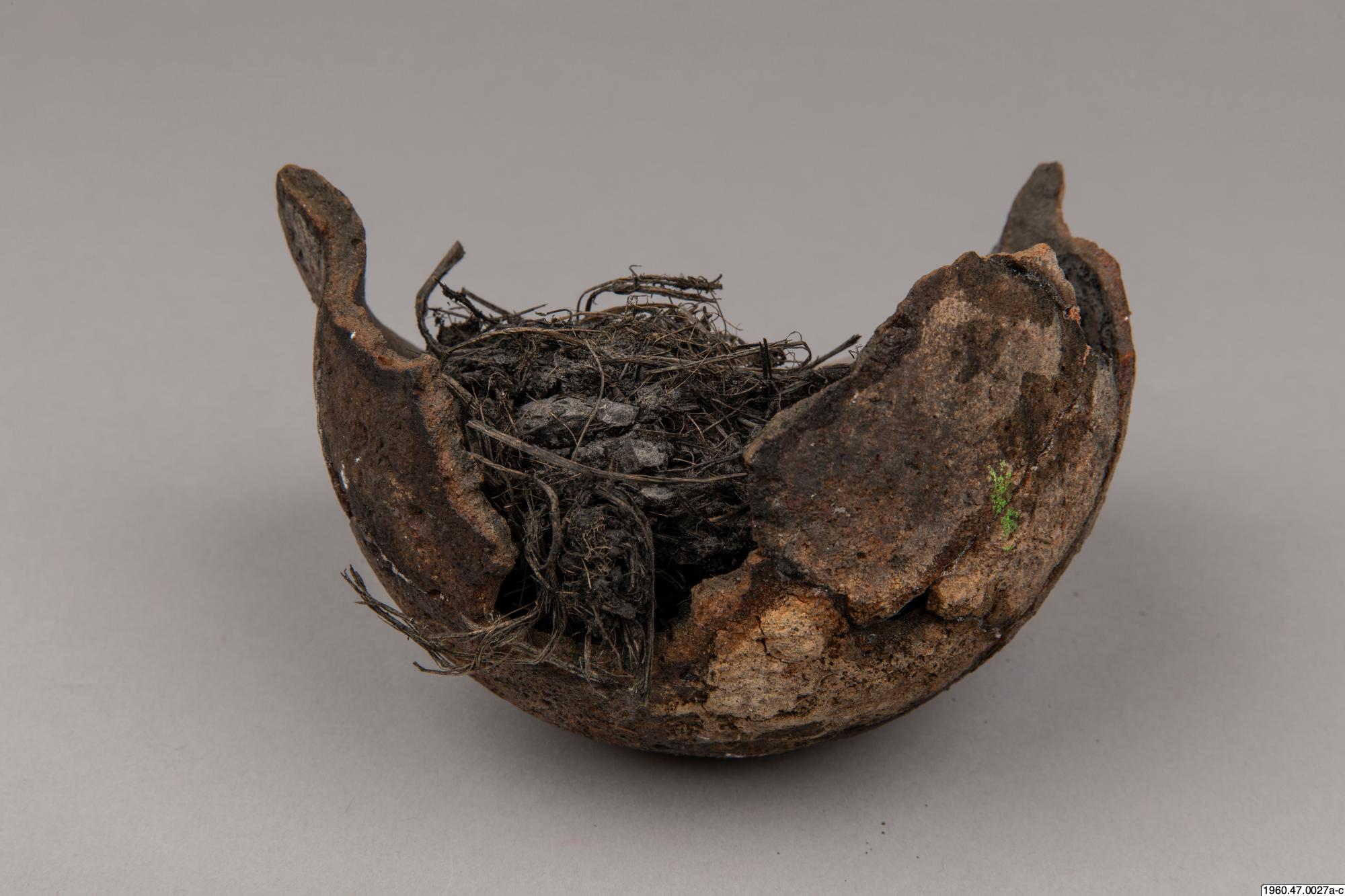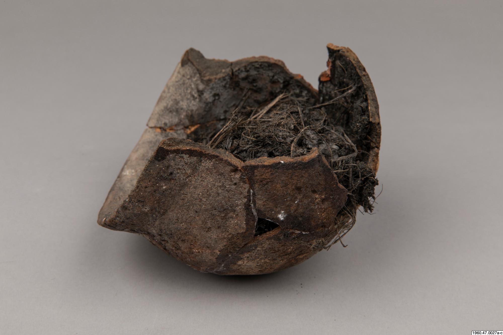 Medicinmansknyte: ett sprucket lerkärl, en kastrull (utan handtag) och en mugg av plåt. I dessa olika saker, främst klumpar av jord. Höjd: a) 11 cm, b) 8,5 cm, c) 8 cm.