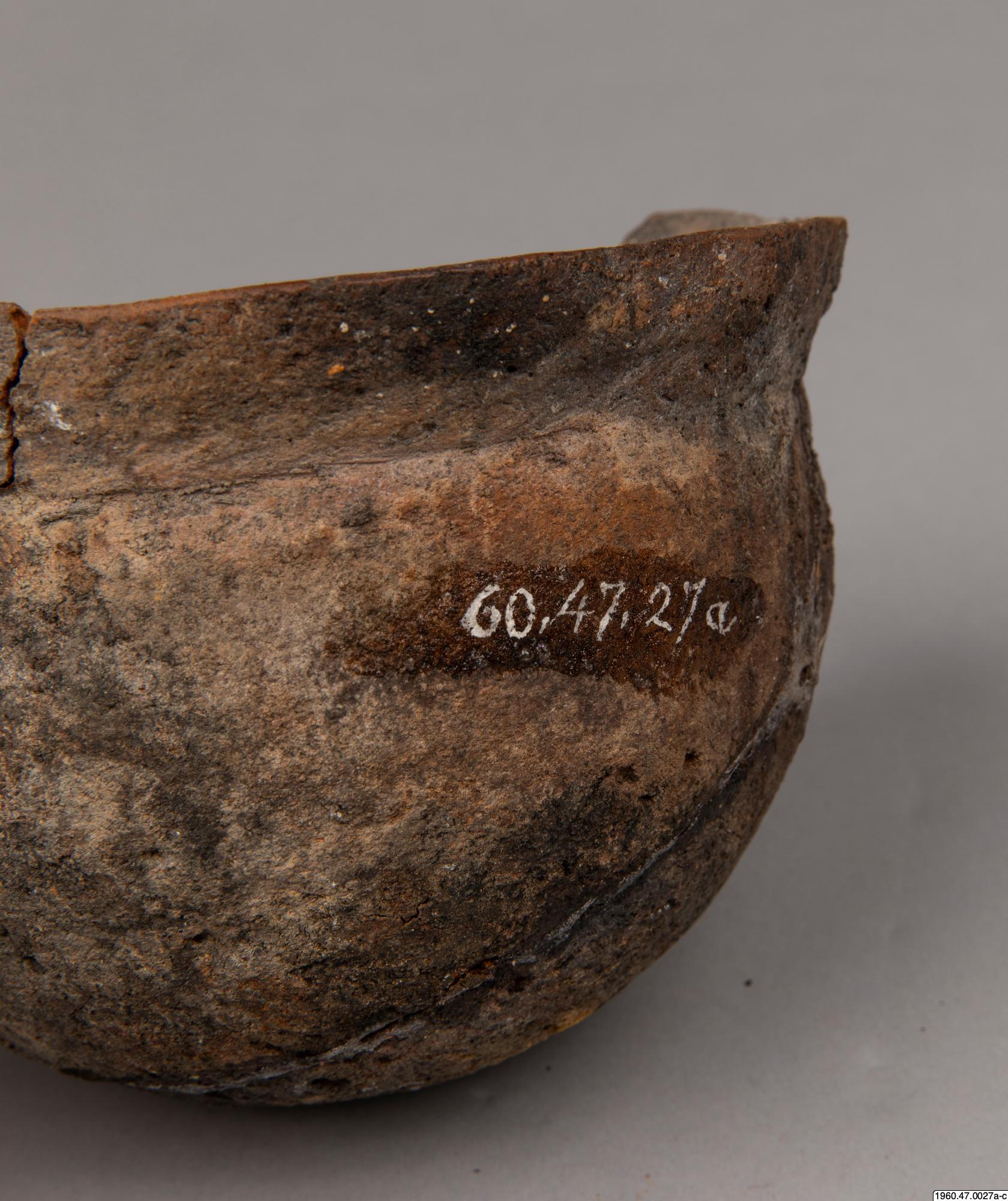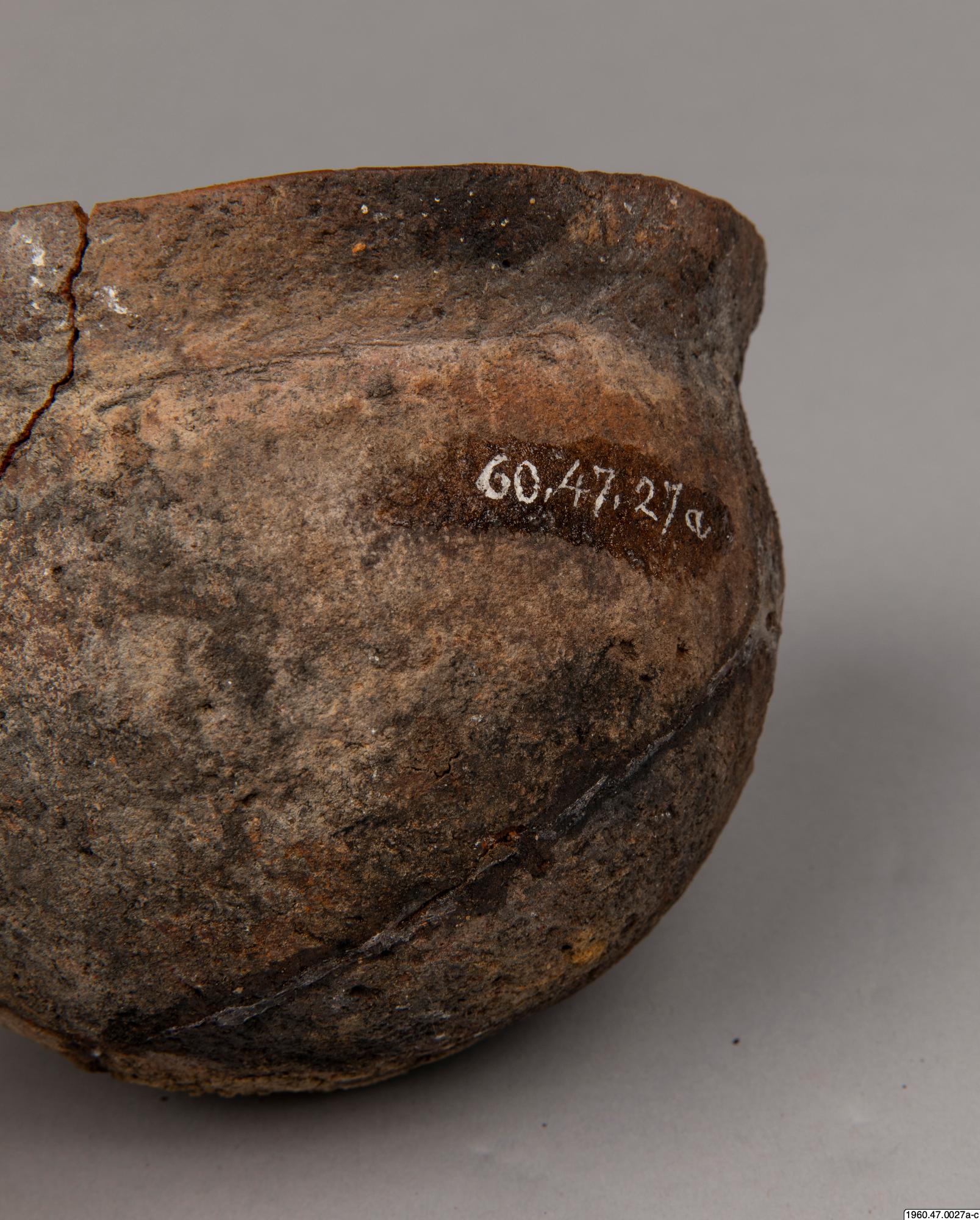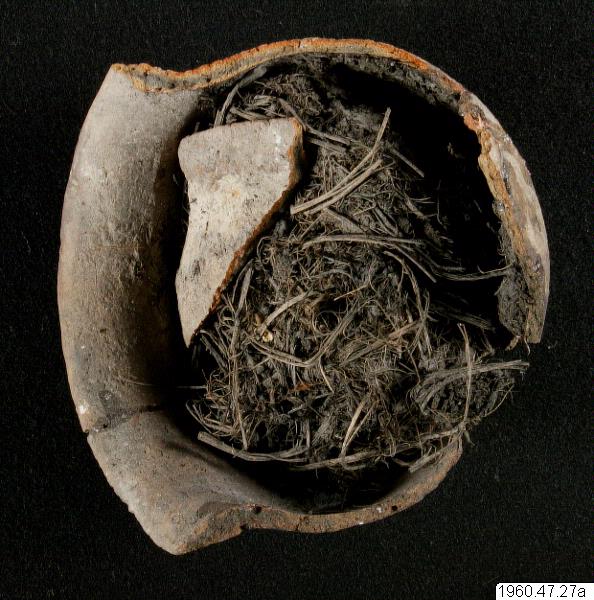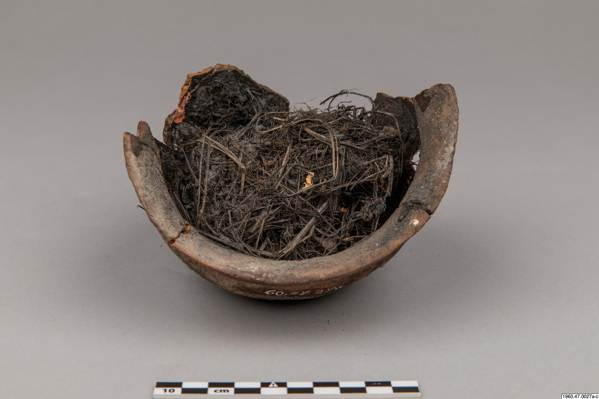 Medicinmansknyte: ett sprucket lerkärl, en kastrull (utan handtag) och en mugg av plåt. I dessa olika saker, främst klumpar av jord. Höjd: a) 11 cm, b) 8,5 cm, c) 8 cm.