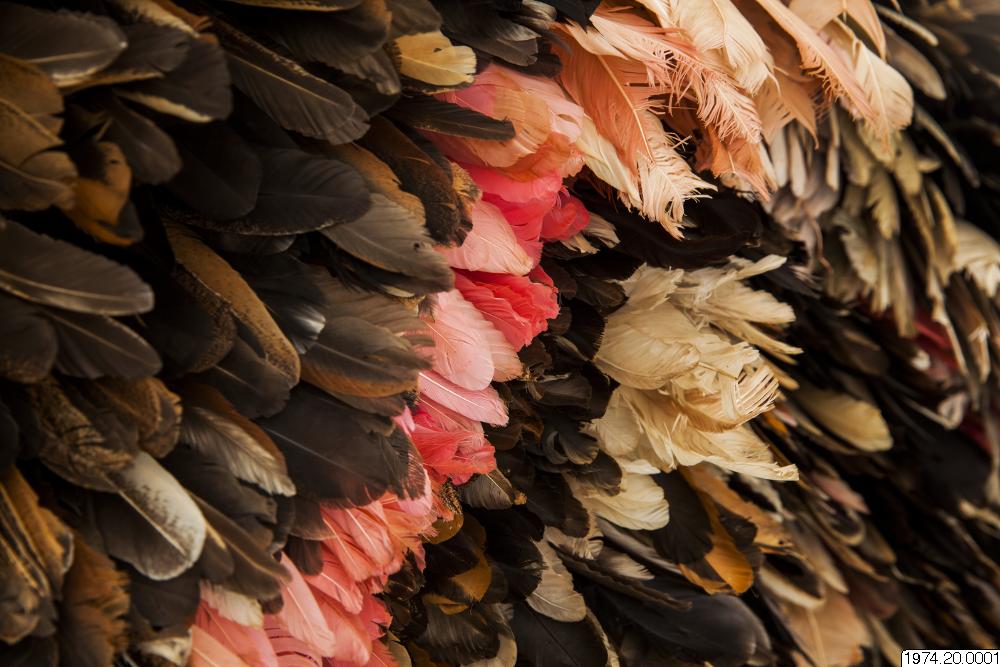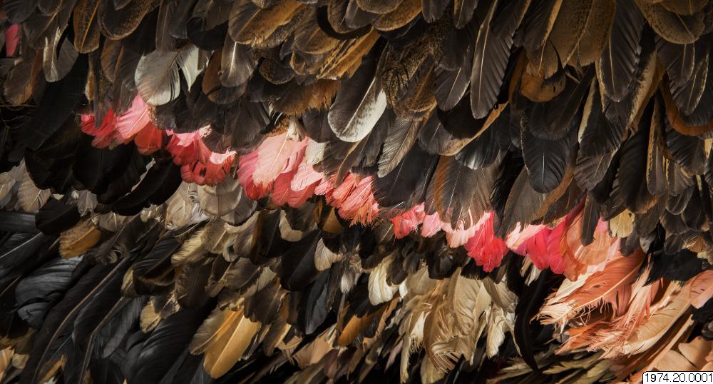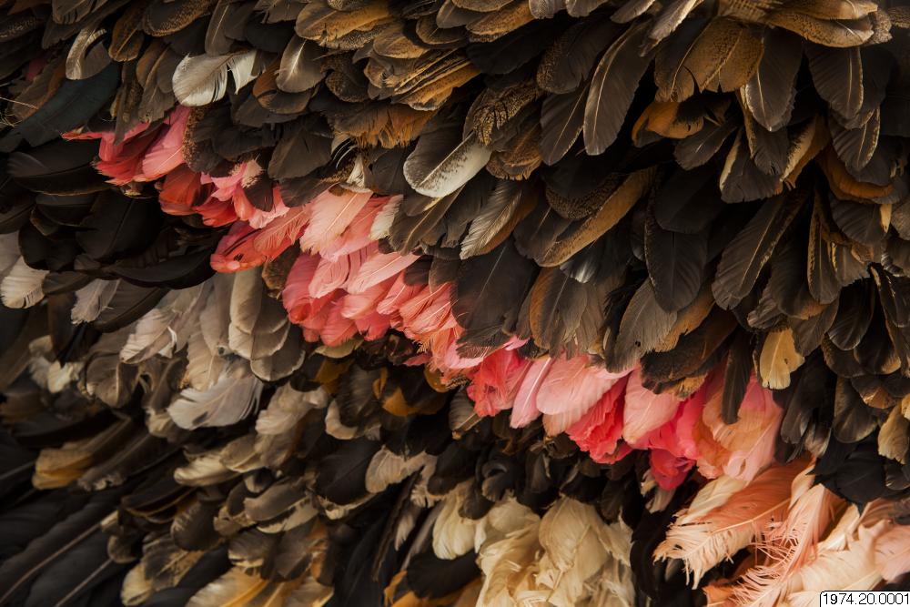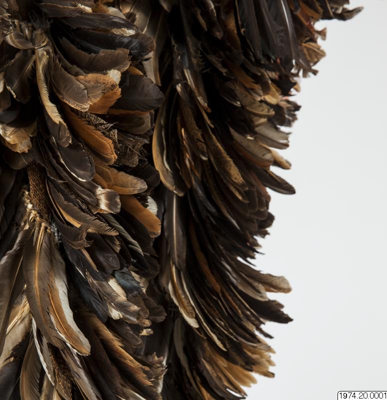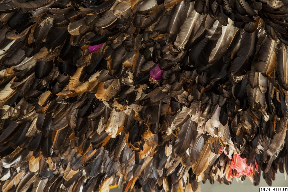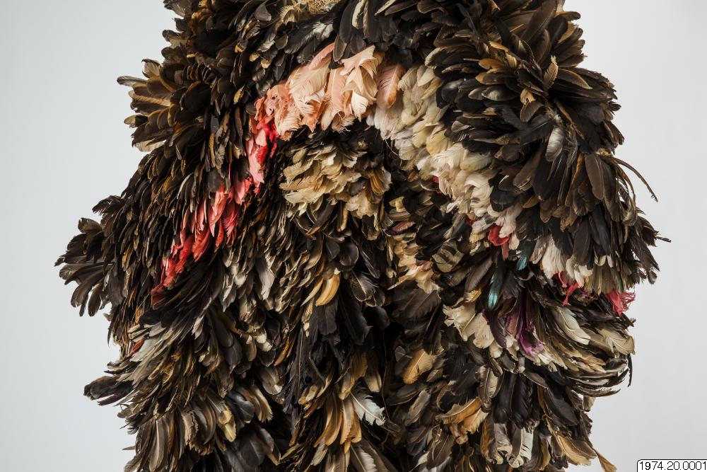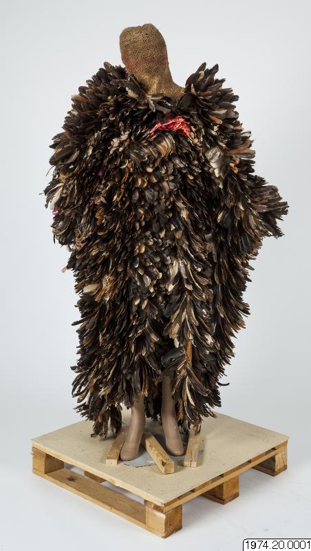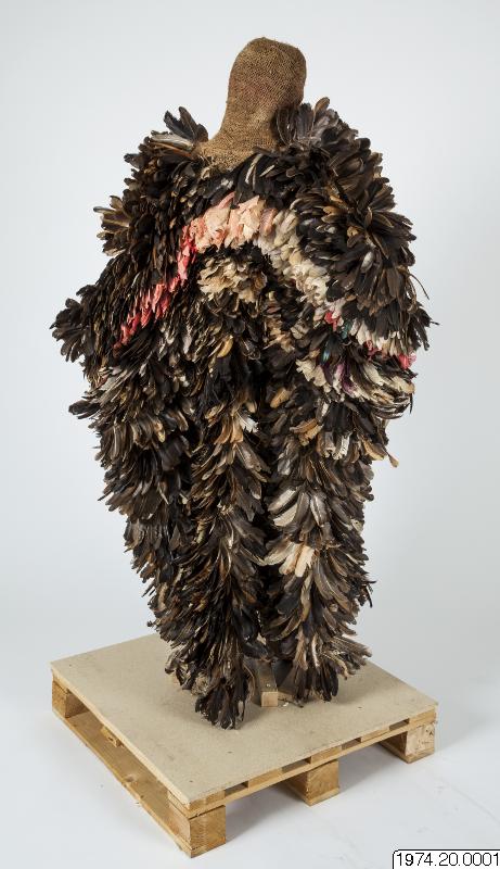 Fjäderskrud med huva som drags över huvudet. Egentligen hör det en mask till dräkten. Kingsley´s "Travels in the West Africa", bild "Death-dance Costumes, Old Calabar (p 335) synes liknande dräkter. Av Mansfield "Urwald-Dokumente" (passim) framgår detta område. Längd: 130 cm. Fotat 2017 inför utställningen Feathers 2018. Dräkten och masken kommer från samma område, men är insamlade vid olika tidpunkter. Dräkten är del av Världskulturmuseets samling, och masken är del av Etnografiska museets samling (1906.11.0002)